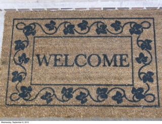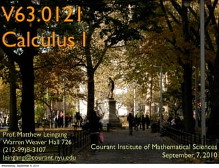 This document outlines information about a Calculus I course taught by Professor Matthew Leingang at the Courant Institute of Mathematical Sciences. It provides details on the course staff, contact information for the professor, an overview of assessments including homework, quizzes, a midterm and final exam. Grading breakdown is also included, as well as information on purchasing the required textbook and accessing the course on Blackboard. The document aims to provide students with essential logistical information to succeed in the Calculus I course.