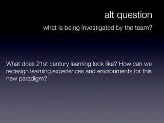 The action learning team aims to redesign learning experiences for 21st century students. Specifically, the team wants to (1) develop an understanding of digital age learning, pedagogy, and design tools; (2) create learning experiences using iPads as effective digital tools rather than just digitizing current practices; and (3) explore how mobile tools like iPads can impact curriculum design, pedagogy, learning spaces, and physical structures. The team will focus on areas like digital learning, pedagogy, curriculum design, and rethinking learning spaces.