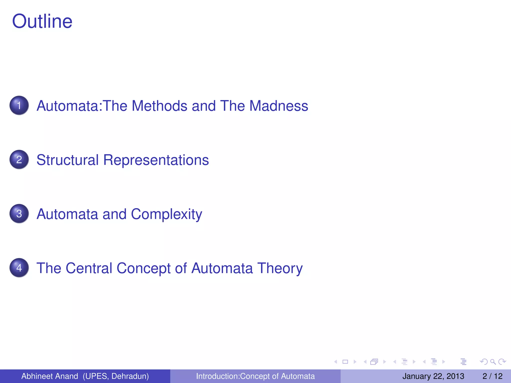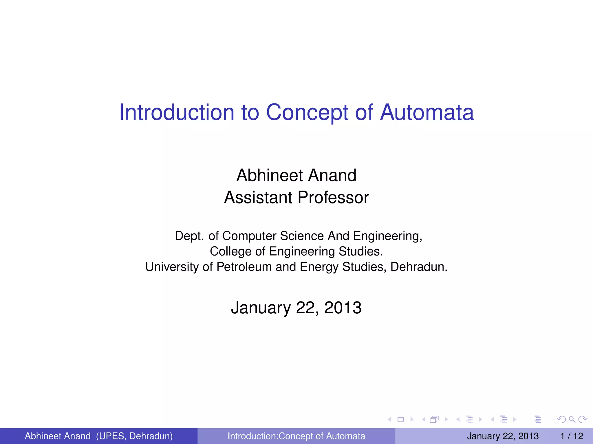 This document introduces the concept of automata. It discusses that automata theory studies abstract computing devices and was originally proposed to model brain function but proved useful for other purposes like designing digital circuits. Automata can model systems that have a finite number of states. There are two important notations used in automata theory - grammars and regular expressions. Automata are essential for studying the limits of computation in terms of what problems are decidable and what problems are intractable. The central concepts of automata theory include alphabets, strings, concatenation of strings, reverse of strings, and Kleene closure.