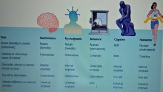 Psychology began as a branch of philosophy but emerged as a scientific field in the late 19th century. Early psychologists had differing views on the structure and function of the mind, leading to schools of thought like structuralism, functionalism, and Gestalt psychology. Today, psychology incorporates multiple perspectives including neuroscience, psychodynamic, behavioral, cognitive, and humanistic approaches to fully understand human behavior.