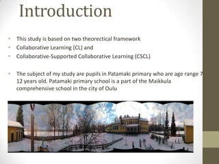 The document discusses a study on using Kodu GameLab to enhance teaching and learning for primary school pupils in Patamaki, Finland. The study uses a mixed methods approach including observation and questionnaires to examine how pupils interact with peers and teachers when using Kodu. Results found that Kodu provides opportunities for student-student and student-teacher interaction, helps students learn in various situations, and enhances scaffolding, critical thinking, creativity, and self-motivation.