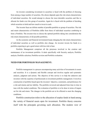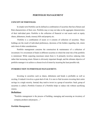 Portfolio management involves constructing a collection of investments that minimizes total risk while maximizing returns. The objective is to achieve a chosen level of return with the least possible risk. A portfolio combines different assets that have their own individual risks and returns in order to reduce overall risk through diversification. Portfolio management aims to balance safety, steady income, capital appreciation, marketability, liquidity, and tax planning to meet investors' objectives. It is an ongoing process of developing and implementing investment strategies, reviewing performance, and evaluating results.