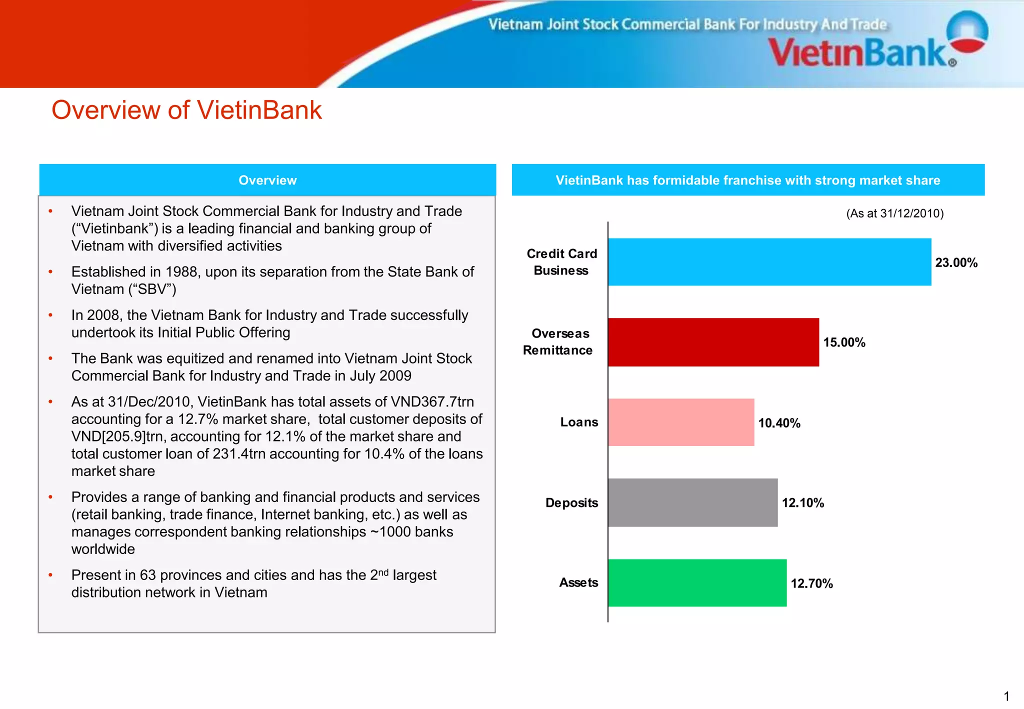 VietinBank is one of the leading banks in Vietnam with total assets of VND367.7 trillion as of December 2010, accounting for a 12.7% market share. It has a large branch network of 1,093 branches across 63 provinces and cities in Vietnam, the second largest distribution network in the country. VietinBank offers a range of banking products and services including retail banking, trade finance, credit cards, and internet banking. It aims to further expand its business and increase market share in the coming years.