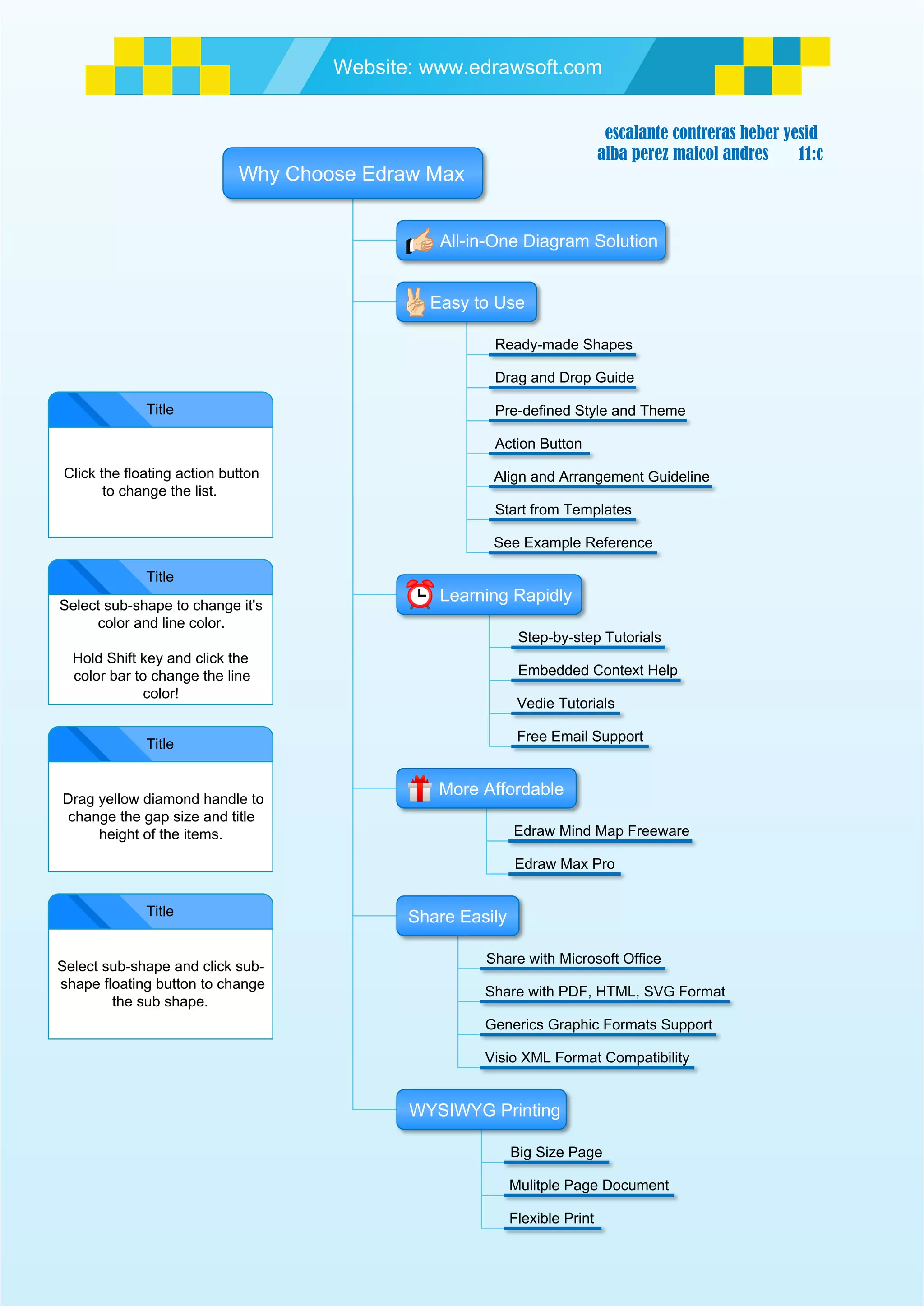 This document provides an overview of the features and benefits of Edraw Max, an all-in-one diagramming solution. It highlights that Edraw Max is easy to use, allows for rapid learning, is more affordable than competitors, and makes it simple to share diagrams in various formats. The document also lists some of Edraw Max's specific capabilities, such as creating large diagrams, multi-page documents, flexible printing, and compatibility with Microsoft Office and Visio files.