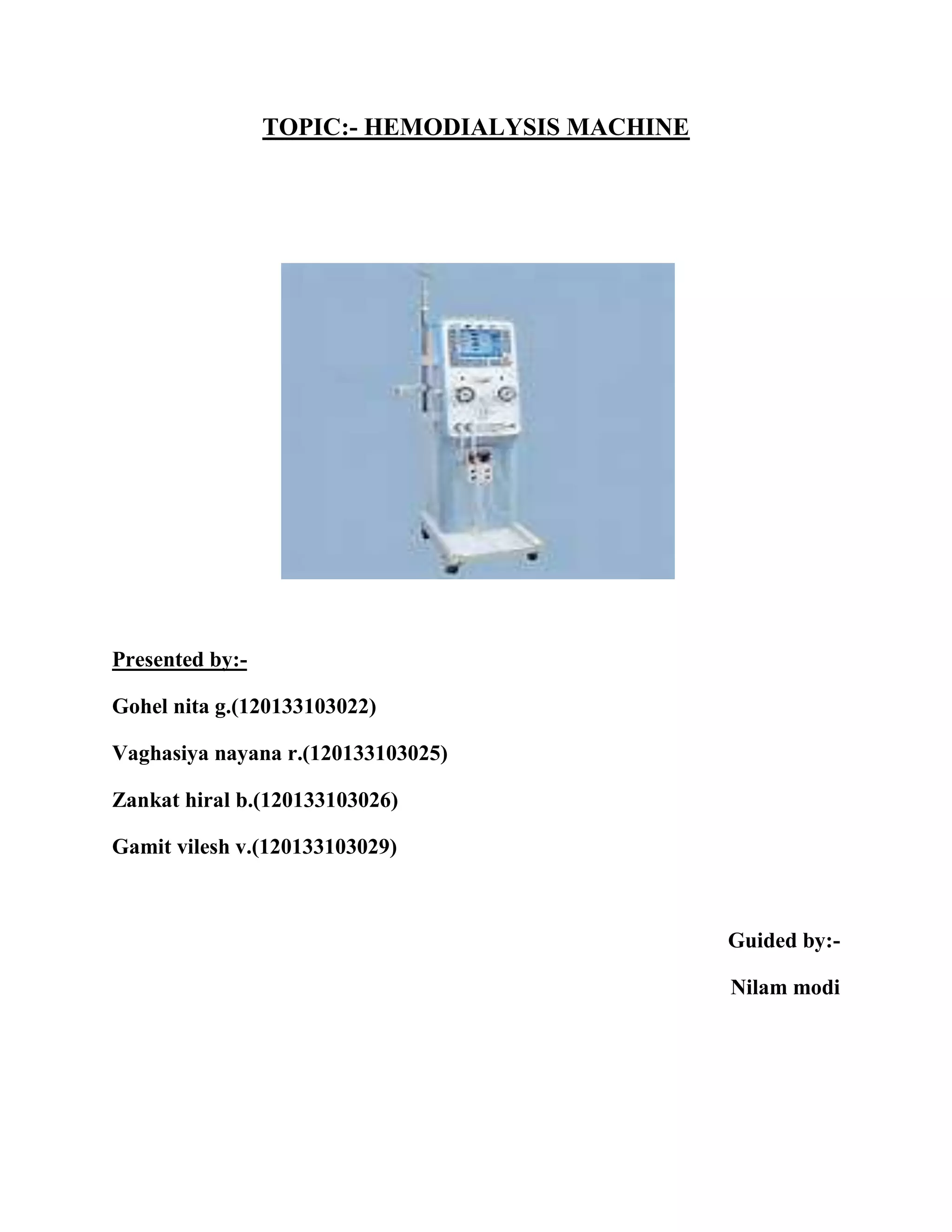 This document provides information about hemodialysis machines. It discusses how hemodialysis machines work by pumping blood and dialysate through a dialyzer to remove waste and fluid from the bloodstream. The main components of hemodialysis machines are the water system, which purifies water used in dialysate, and the dialyzer, which contains hollow fibers that allow diffusion and osmosis across a semipermeable membrane. Hemodialysis machines must meet various technical specifications to safely and effectively perform hemodialysis treatments.