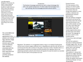 For the Rockstar energy drink website, it notes the unique homepage title with a star instead of an 'A' and promotion of extreme sports. It also discusses the simple but eye-catching layout, advertising, and targeting of young males aged 16-25 through extreme images.