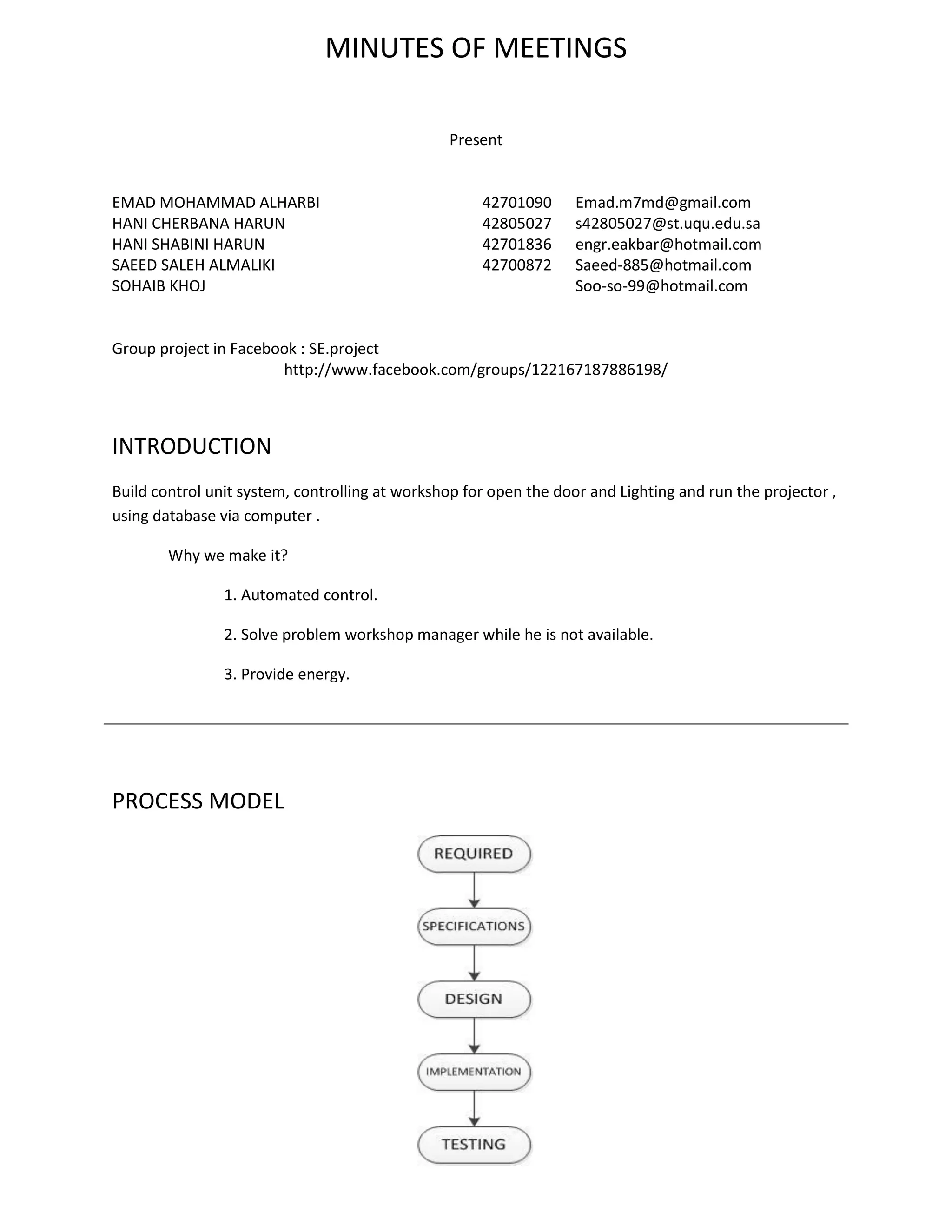 The minutes document the meeting of five students - Emad, Hani C, Hani S, Saeed, and Sohaib. They will work on a group project to build a control unit system for a workshop that can automatically open doors, control lighting, and run a projector using a database accessed from a computer. The project aims to provide automated control, solve problems when the manager is unavailable, and conserve energy. Emad will serve as the project manager.