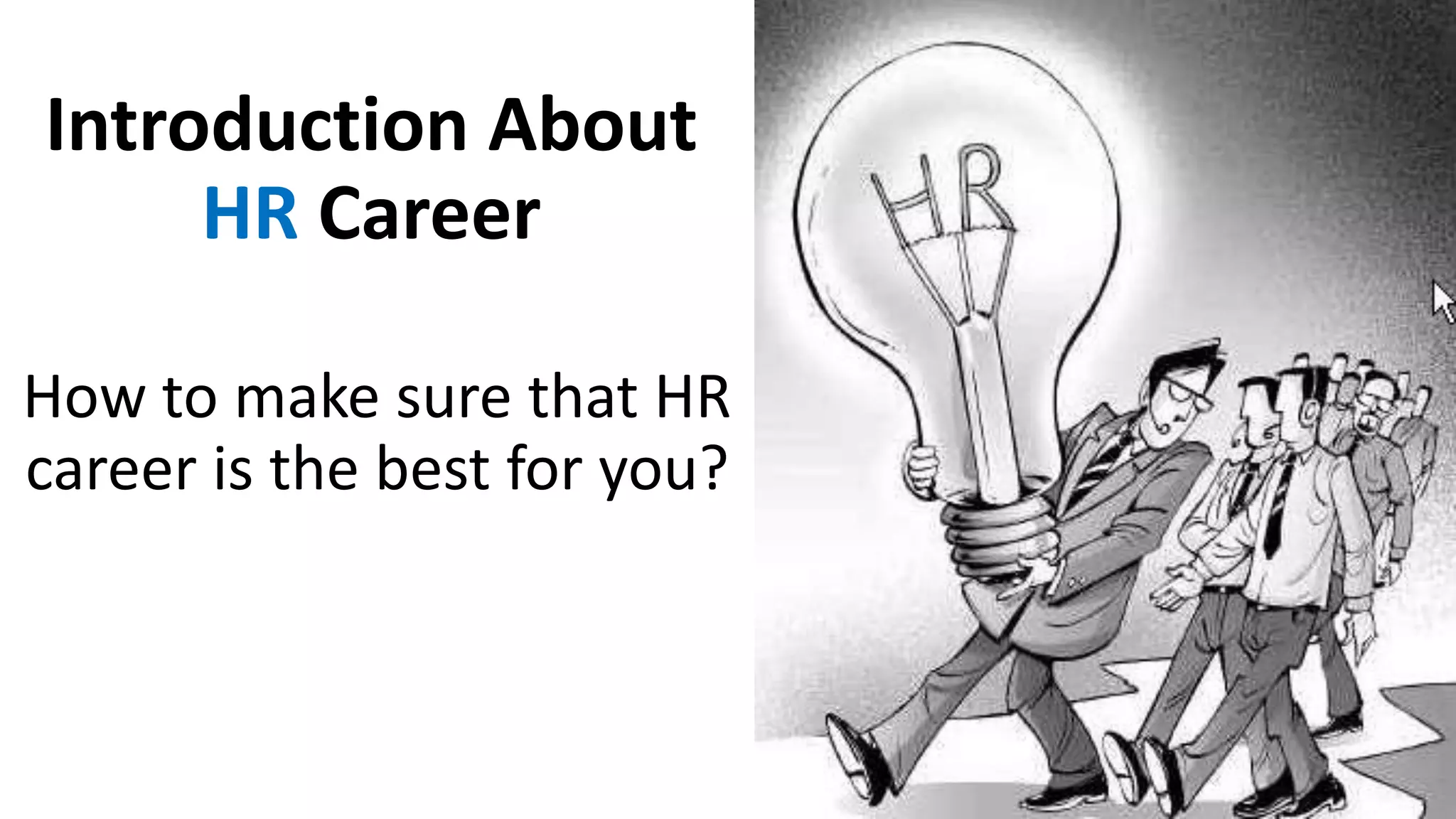 This document discusses how to determine if an HR career is right and provides an overview of the HR field. It outlines the real purpose of HR as hiring, retaining, and developing talent to achieve organizational goals. It also describes the major functions of HR such as recruitment, training, performance management, compensation and benefits, and employee relations. Finally, it offers tips for how to be the best in HR such as staying updated, staying connected, planning big projects, and networking extensively.