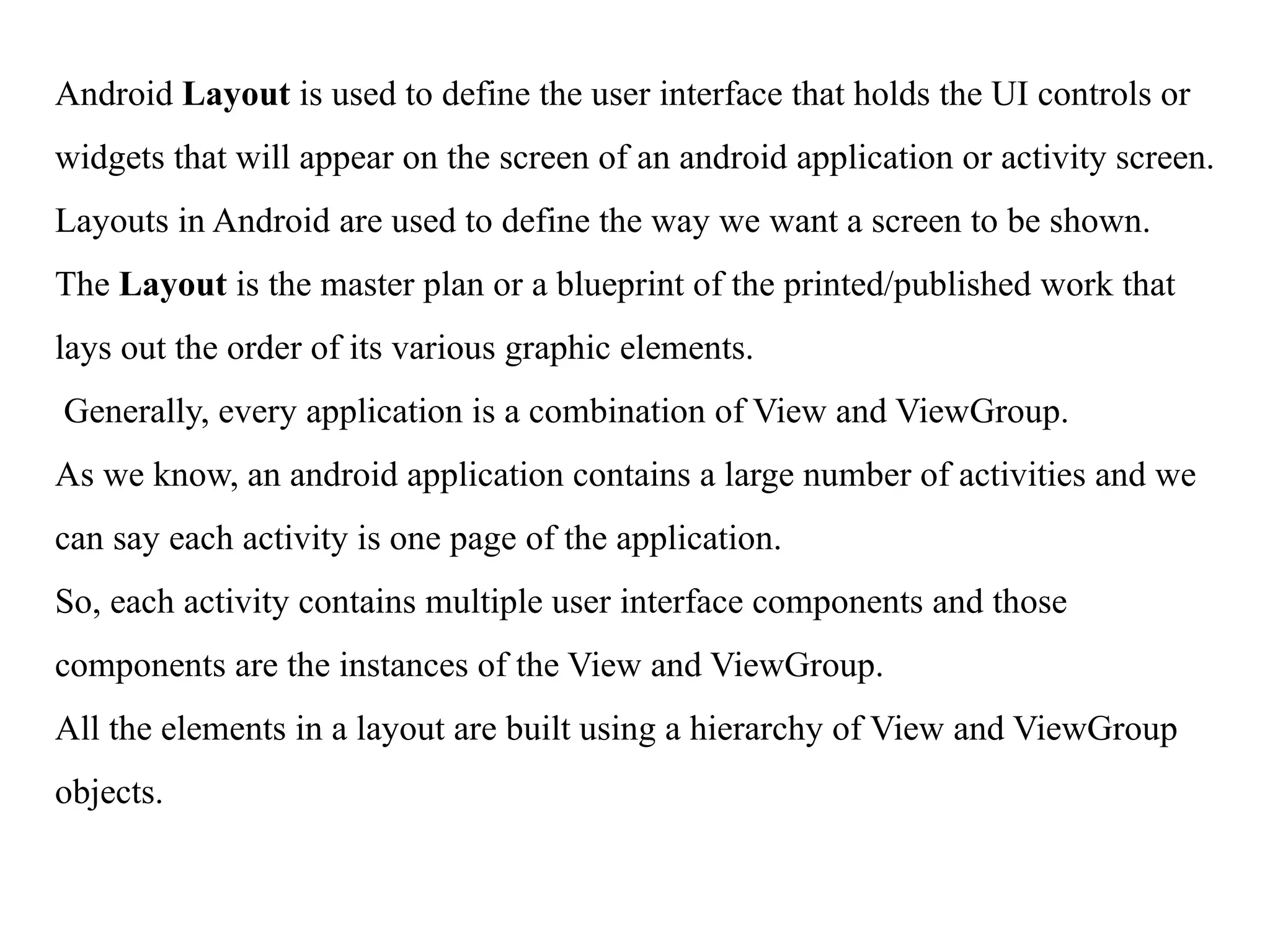 Layouts in Android are used to define the way we want a screen to be shown.
