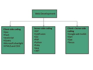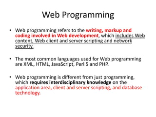 The document provides an introduction to web technology and programming, detailing the differences between client-side and server-side programming, as well as various architectures like single-tier, two-tier, three-tier, and n-tier. It explains essential components of the web, including URLs, IP addresses, DNS, and HTTP protocols, while discussing their functionalities and interrelationships. Overall, it outlines the infrastructure of web applications and the principles of web development.