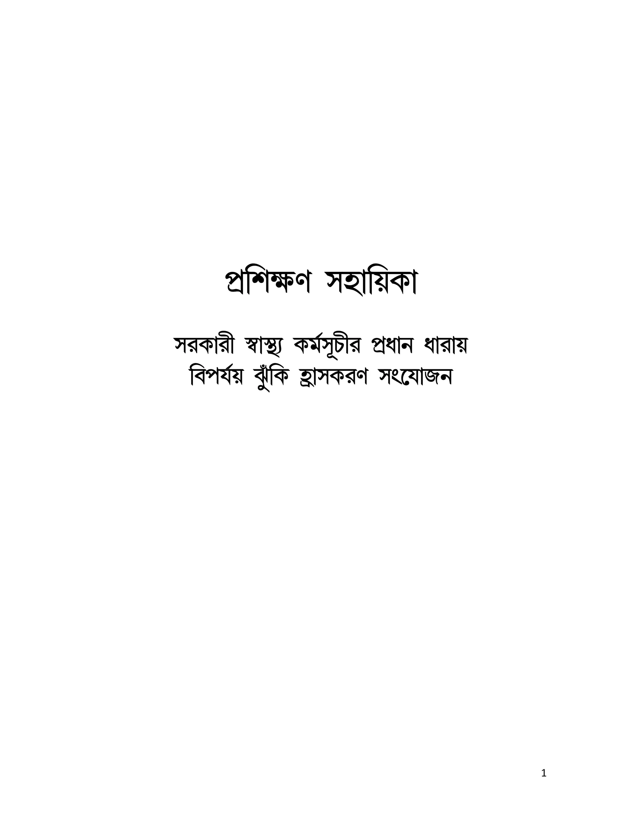 x ¢h¢iæ fË¡L«¢aL J je¤oÉL«a c¤−Ñk¡−Nl L¡l−Z œ²jhdÑj¡e ¢hfæ fª¢bh£, S¡¢a, pj¡S J j¡e¤−ol S£he J S£¢hL¡ ¢eu¢ja r¢aNËÙÛ qu z Na L−uL cn−L p¡l¡ fª¢bh£−a ¢hfkÑ−ul pwMÉ¡ hý…e −h−s−R z haÑj¡e Smh¡u¤ f¢lhaÑe pwœ²¡¿¹ cªø¡¿¹ HC Lb¡C fËj¡¢ea L−l −k c¤−Ñk¡N J ¢hfkÑ−ul f¢lpwMÉ¡e BlJ h¡s−h Hhw B−l¡ −hn£ −S¡l¡−m¡ q−h z ¢hfkÑu j¡e¤o, S¡¢a ab¡ pj¡−Sl Eæ¢a ab¡ pgma¡−L dÆwp L−l z ¢hfkÑ−ul j§m L¡le…¢ml Efl −hn£ L¡S e¡ qJu¡u HC ¢hfkÑu…¢m Millennium Development Goal Hl ph−Q−u hs h¡d¡ q−u c¡¢sy−u−R z Hyogo Framework for Action (HFA) 2005 - 2015 −a h¡dÉa¡j§mL i¡−h ¢hfkÑu fËi¡h−L Lj¡−e¡l Hhw Eæu−el HL¢V Af¢lq¡kÑ Ef¡c¡e ¢qp¡−h ¢hfkÑu T¥y¢L qÊÊ¡pLlZ−L (Disaster Risk Reduction) pjÙ¹ LjÑp§Q£−a pwk¤š² Ll¡l Lb¡ hm¡ q−u−R z ¢hfkÑu Ty¥¢L qÊÊ¡pLlZ −Lhmj¡œ ¢h‘¡e£, f¢l−hn¢hc Hhw p¡j¡¢SL EæueL¡l£−cl L¡S eu z ¢ÙÛ¢aÙÛ¡fL BbÑ - p¡j¡¢SL Eæue fË¢œ²u¡−aJ ¢hfkÑu T¥y¢L qÊÊ¡pLl−el i¨¢jL¡ Ni£l z i¡lah−oÑ f’¡−ua hÉhÙÛ¡ (Panchayati Raj Institution / PRI) qm NË¡jÙ¹−ll fËn¡pe hÉhÙÛ¡ k¡ Eæue LjÑp§Q£ h¡Ù¹h¡ue Ll¡l SeÉ °al£ z HC hÉhÙÛ¡ Nea¡¢¿»L L¡W¡−j¡l HL¢V n¢š²n¡m£ Ef¡c¡e z NË¡j J pj¡S Eæu−e f’¡−ua …l¦aÆf§ZÑ i¨¢jL¡ f¡me L−l b¡−L z HC L¡l−eC, ¢hfkÑu T¥y¢L qÊÊ¡pLl−el e£¢a…¢m−L a«ej§m Ù¹−ll Eæue fË¢œ²u¡u p¢Çj¢ma Ll−a q−h z Hja¡hÙÛ¡u f’¡−ua pcpÉ Hhw hÔL B¢dL¡¢lL−cl ¢hfkÑu T¥y¢L qÊÊ¡pLlZ J Eæu−el p−‰ a¡l pÇfÑL pð−å pjÉL ‘¡e b¡L¡ clL¡l z HC fË¢nrZ¢ÙÛ¢aÙÛ¡fL ¢hfkÑu T¥y¢L qÊÊ¡pLlZ fË¢œ²u¡l SeÉ HL¢V …l¦aÆf§eÑ fc−rf z HFA −a J HC HLC Lb¡l E−õM B−R z HR¡s¡J ÙÛ¡e£u j¡e¤−ol AwnNËq−el Lb¡J E−õ¢Ma B−R z HC fË¢nr−Zl fË¢nrLNZ ¢hfkÑu T¥y¢L qÊÊ¡pLlZ pð−å p−Qaea¡ hª¢Ü J rja¡ hª¢Ül j−a¡ hs E−Ÿ−nÉl p−‰ S¢sa z HC pq¡¢uL¡¢V fË¢nrZf¢lLÒfe¡ ab¡ f¢lQ¡me¡u pq¡ua¡ Ll−h z f’¡−ua pcpÉ ab¡ hÔL B¢dL¡¢lL−cl fË¢nr−Zl SeÉ huú ¢nr¡l e£¢a…¢m Ae¤ple Ll¡ q−u−R z HR¡s¡J fË¢nr−Zl SeÉ Ae¤L¨m f¢l−hn, fË−u¡Se£u p¡jNË£, fË¢nrZfÜ¢a ab¡ fË¢nr−Zl j§mÉ¡ue pð−åJ E−õM B−R z 2z fË¢nr−Zl hªqv E−ŸnÉ (Broad Objectives of the Training) x • haÑj¡e plL¡l£ LjÑp§Q£ / fËLÒf…¢m à¡l¡ ¢hfkÑu T¥y¢L qÊÊ¡pLlZ J a¡l LjÑ−rœ pð−å p−Qaea¡ hª¢Ü z • rja¡u−el j¡dÉ−j ¢hfkÑu T¥y¢L J hÉhÙÛ¡fe¡ pð−å j¡e¤o−L fËÙ¹¥a Ll¡ z • plL¡l£ cçl, −hplL¡l£ pwÙÛ¡, p¡d¡le j¡e¤o ab¡ AeÉ¡eÉ Awn£c¡l−cl j−dÉ pjeÄu p¡de à¡l¡ ¢hfkÑ−u fËi¡¢ha j¡e¤o−cl ¢hfæa¡ Lj¡−e¡ z 3z ü¡ÙÛÉ −r−œ fË¢nr−Zl ¢h−no E−ŸnÉ (Specific Objective of training - Health Sector) x fË¢nrZ−n−o AwnNËqZL¡l£l¡ ¢ejÀ¢m¢Ma ¢hou…¢m pð−å hÉ¡MÉ¡ (Explain) Ll−a f¡l−he - L) ü¡−ÙÛÉl j§m Ef¡c¡e…¢m ¢h−noax ¢hfkÑ−ul f¢lfË¢r−a BO¡a, jªaÉ¥ Hhw a¡l L¡le 2