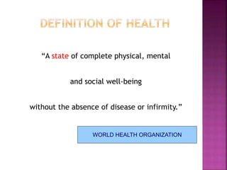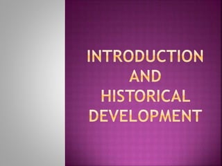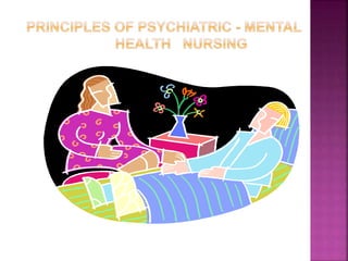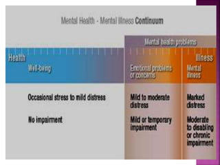 The document discusses the history and evolution of mental health and psychiatry. It notes that ancient societies often viewed mental illness as supernatural or religious in nature and treatments were cruel. The first psychiatric hospitals were built in the medieval Islamic world which utilized more clinical approaches. Developments continued with the introduction of moral treatment in Europe in the 18th century and growth of institutions. The 20th century saw advances like psychoanalysis, psychopharmacology with drugs like lithium and chlorpromazine, ECT, and lobotomy. The field has continued to evolve with deinstitutionalization, community-based care, genetics research, and neuroimaging.