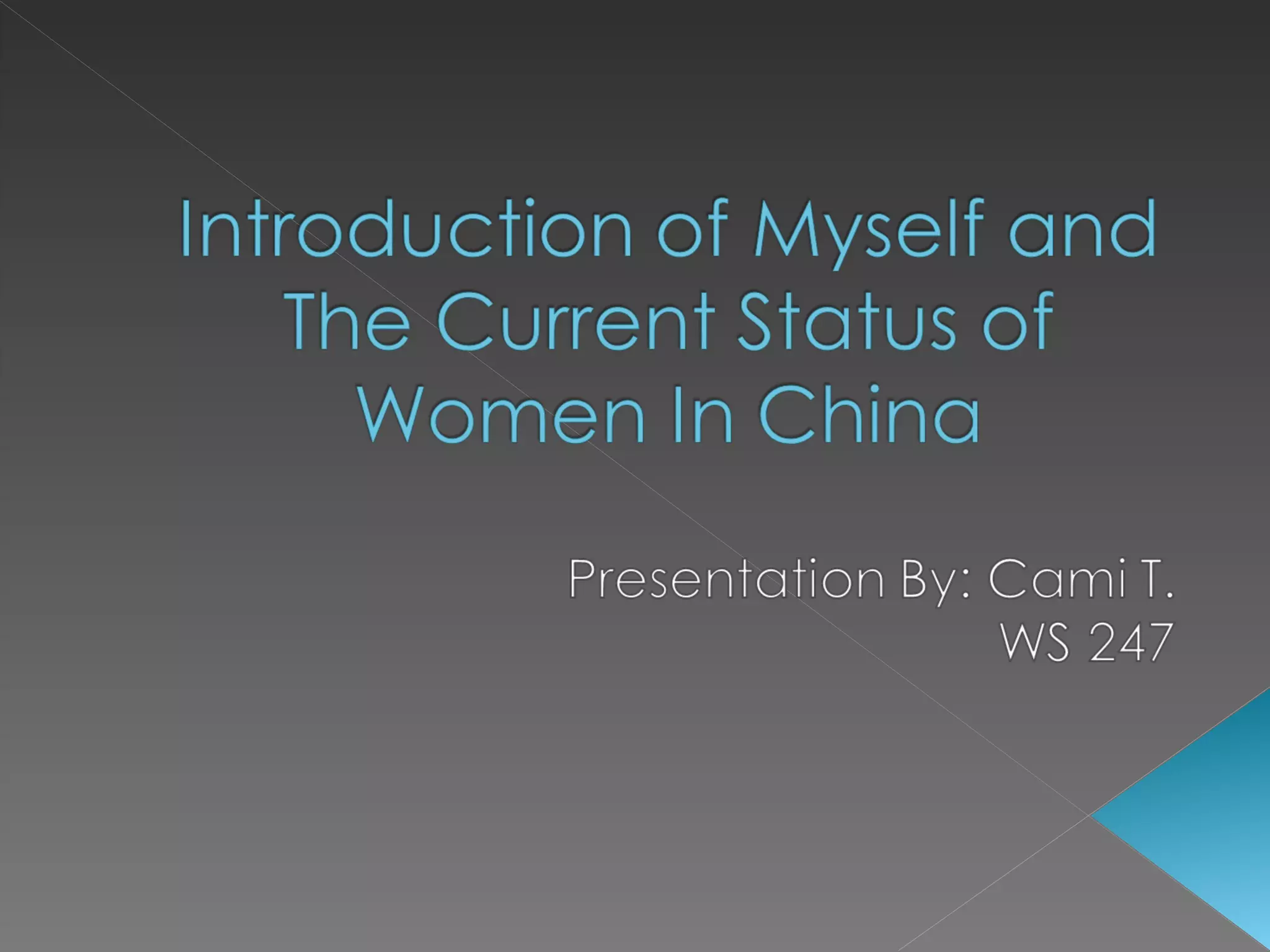 Cami introduces herself as a 19-year-old sophomore biology major at MSUM who wants to become a veterinary technician. She grew up on a small dairy farm and now works in her university's admissions office. She enjoys animals, scrapbooking, pickles, and the outdoors. The document then discusses the history of women's status in China, including being considered property without rights to divorce or own property, and forced into early marriage and lack of education. It notes reforms that now allow women choices over marriage, divorce, property, education, and entering the workforce.