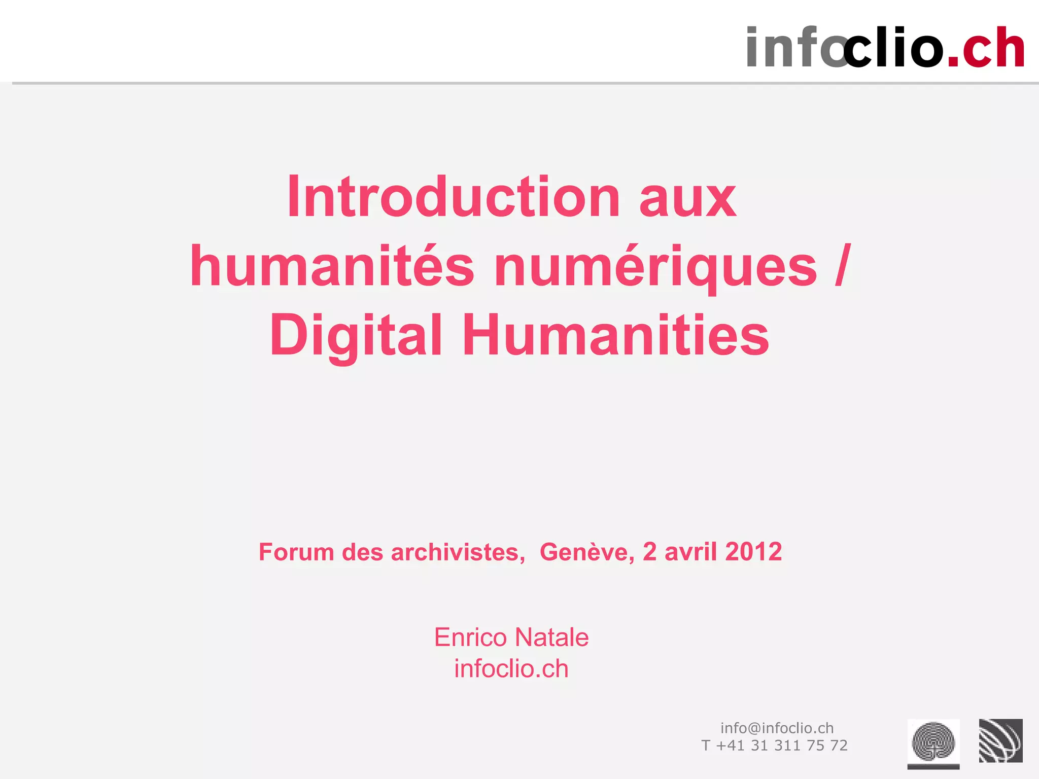 The document provides an introduction to digital humanities and discusses several key topics: