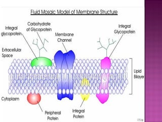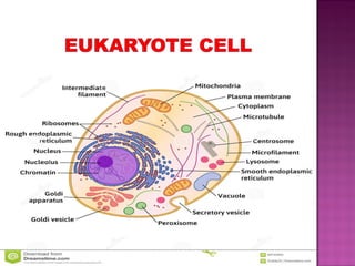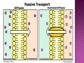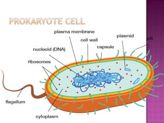 The document discusses the key differences between prokaryotic and eukaryotic cells. It explains that prokaryotic cells lack a nucleus and organelles, while eukaryotic cells have a well-defined nucleus surrounded by a membrane as well as various intracellular organelles like mitochondria and chloroplasts. The document also covers cell transport mechanisms, including passive diffusion, facilitated diffusion, and active transport which uses ATP.