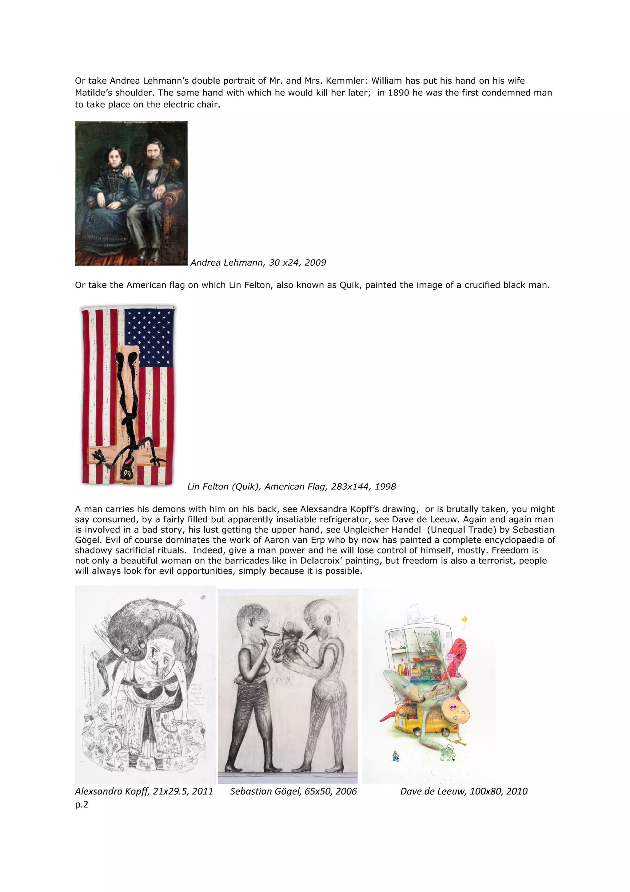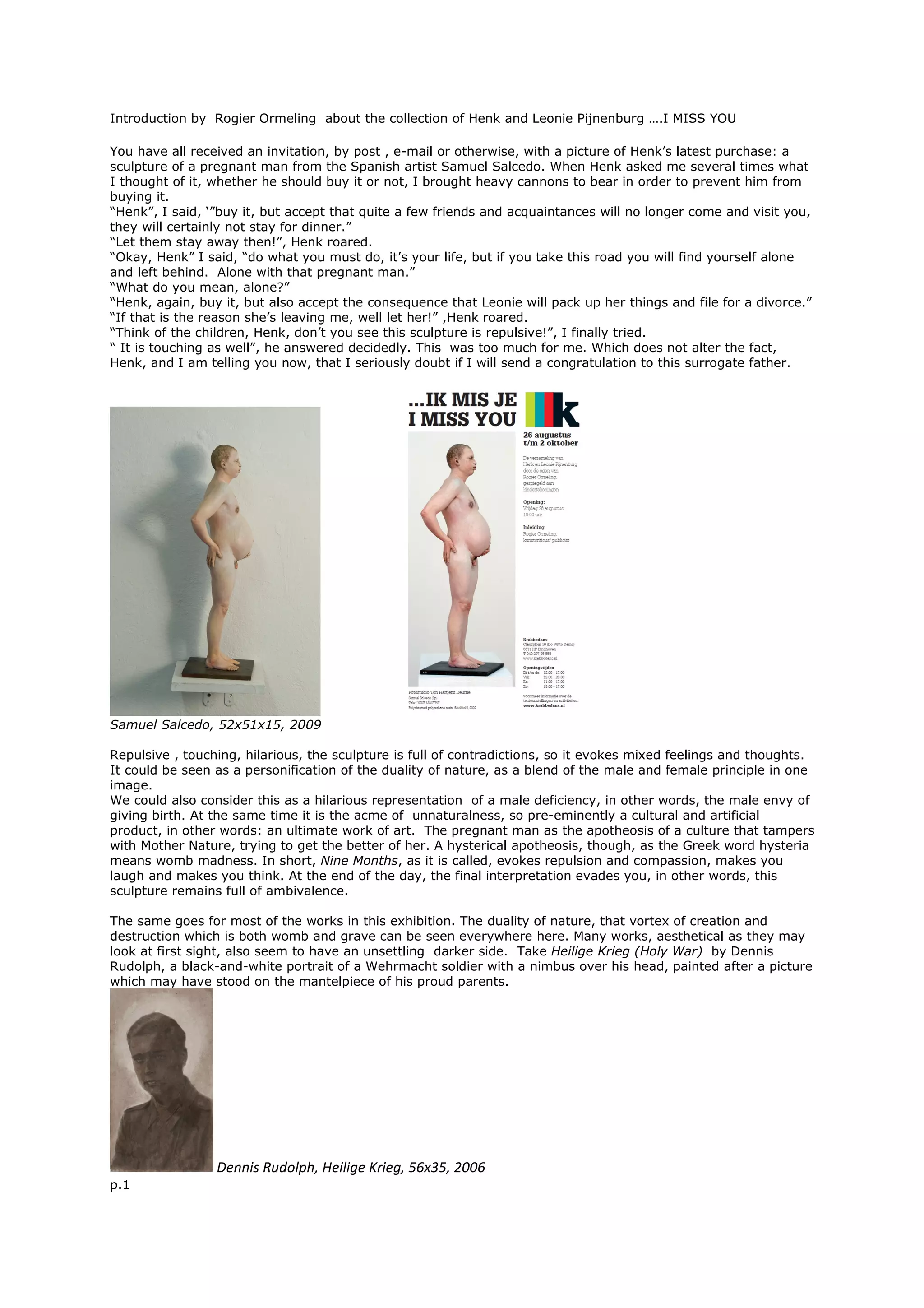 Henk Pijnenburg is an enthusiastic art collector who is passionate about discovering new artists. He considers purchasing a sculpture of a pregnant man, despite his friend's warnings that it may damage his relationships and marriage. Henk is defiant, prioritizing his artistic interests. The document then discusses works in Henk's collection that explore themes of duality and humanity's dark side through mixed or ambiguous messages. It profiles several artists in Henk's collection and how he has supported many young talents as they emerged. The author expresses pride in Henk for his dedication to art.