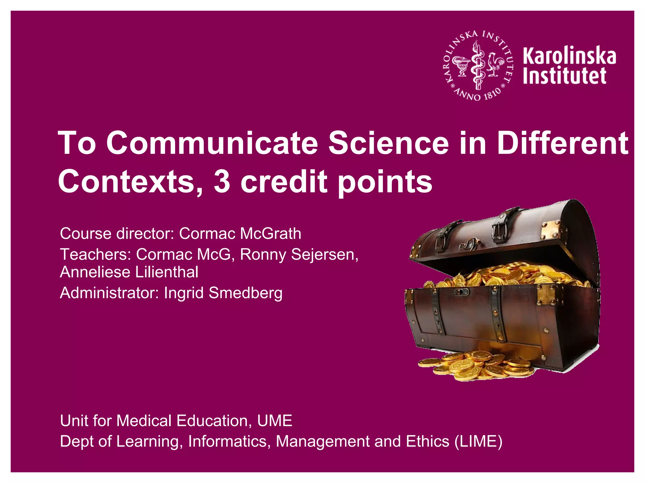 This 3-credit course aims to teach doctoral students how to communicate their research to different audiences. It is directed by Cormac McGrath and includes presentations, seminars, and reflection activities. Through practicing oral presentations to varied groups, reflecting on literature about communication skills, and receiving feedback, students will learn to present their work adapted for general audiences, peers, and scientific contexts. Assessment includes a reflective statement and final oral presentation. The course supports the Dublin descriptors for doctoral education in communicating research to peers and society.