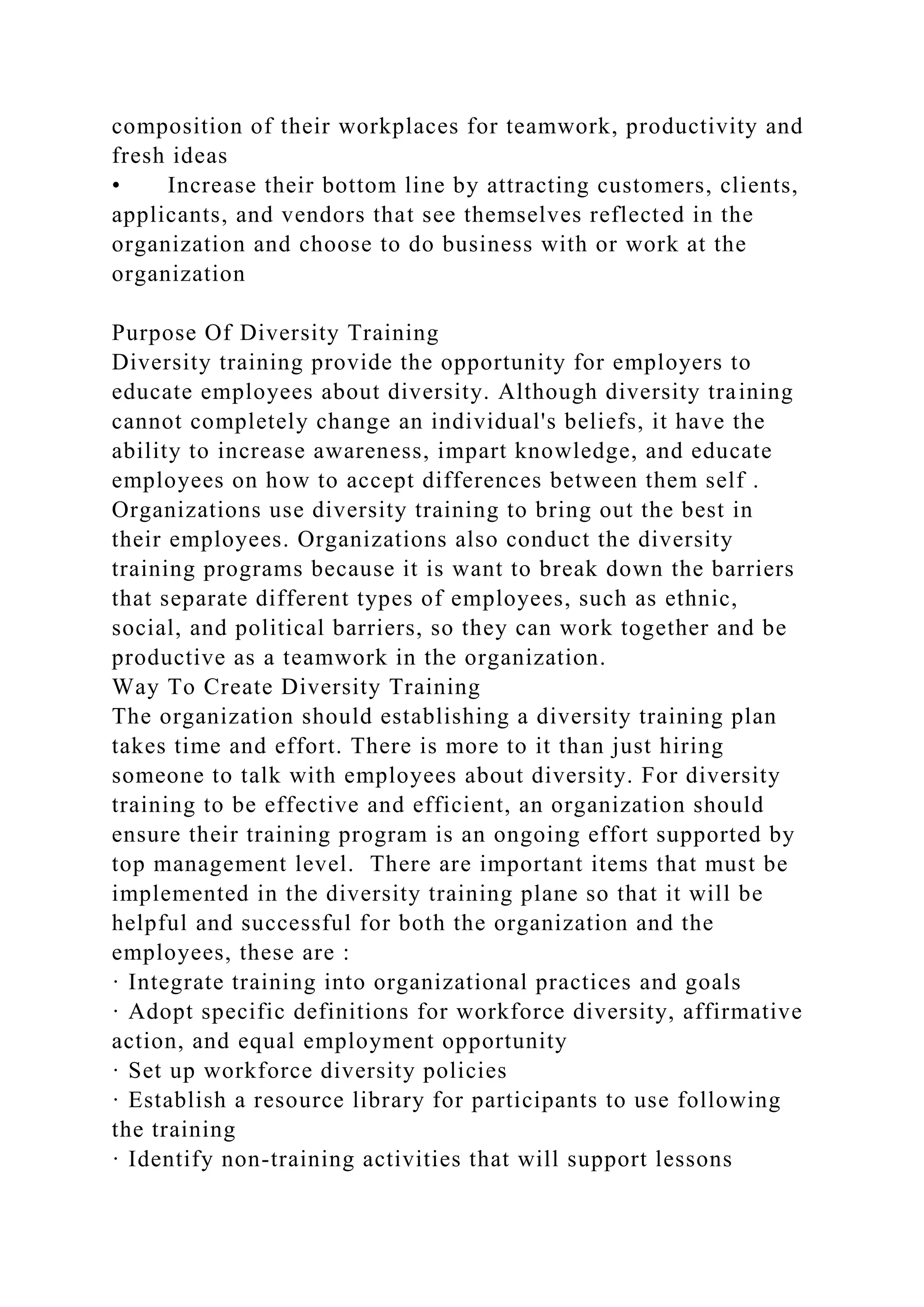 The document discusses the definition and importance of diversity and diversity training in the workplace, emphasizing its role in creating a positive environment that fosters inclusivity and enhances organizational performance. It outlines key objectives of diversity training, such as increasing awareness of diversity issues, reducing biases, and improving teamwork, while also advocating for ongoing training efforts led by top management. Additionally, it highlights methods for implementing diversity initiatives and the benefits of a diverse workforce, including improved problem-solving, employee morale, and customer relations.