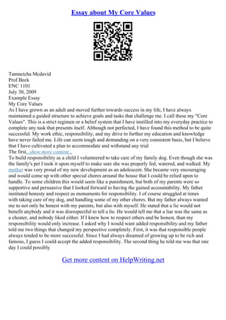 The document discusses the author's core values, emphasizing the importance of work ethic, responsibility, and a commitment to education. It highlights personal experiences that shaped these values, such as caring for a family pet, learning about honesty and respect from parents, and the transformative impact of responsibility on personal success. The text also touches on broader themes like education, management, and introspection, showcasing how these concepts interconnect in personal development.