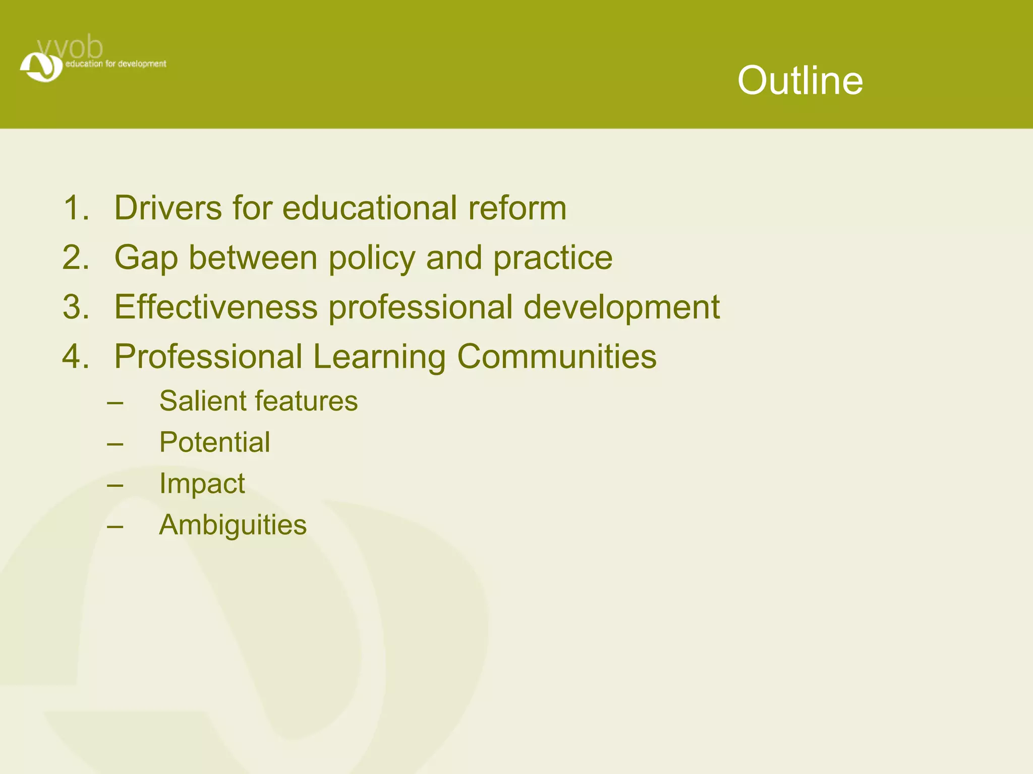 This document discusses the importance and impact of Professional Learning Communities (PLCs) in educational reform, highlighting drivers for change and the gap between policy and practice. It emphasizes effective professional development strategies, the role of collaboration, and the potential benefits of PLCs, while also addressing challenges and ambiguities related to their implementation. The document cites various research findings that demonstrate positive correlations between teacher participation in PLCs and improved teaching practices and student outcomes.