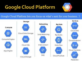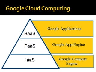 Cloud computing provides on-demand access to shared computing resources like networks, servers, storage, applications and services available over the internet. It offers advantages like cost effectiveness, dynamic scaling, on-demand self-service and measured service. There are three main service models - Infrastructure as a Service (IaaS), Platform as a Service (PaaS) and Software as a Service (SaaS). The document then discusses Google Cloud Platform's IaaS offering called Google Compute Engine and its PaaS offering called Google App Engine.