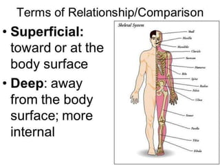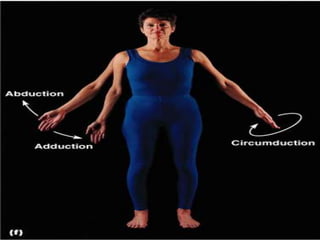 The document discusses various topics in human anatomy. It defines anatomy as the study of the structure of the human body and describes its main subdivisions. These include cadaveric anatomy, regional anatomy, systemic anatomy, and living anatomy which can be studied through inspection, palpation, and various medical imaging techniques. It also discusses embryology, histology, surface anatomy, radiographic anatomy, comparative anatomy, and applied anatomy. Finally, it outlines some key anatomical terminology, body positions, planes, and directions as well as movements like abduction, adduction, and rotation.