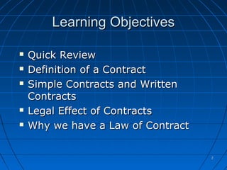 This document provides an introduction to contract law. It defines a contract as a legally binding agreement and notes that simple contracts do not need to be in writing. It discusses the different legal effects of contracts, including valid, void, voidable, and unenforceable. Modern society relies on the exchange of goods and services between individuals and businesses, and contract law provides structure for these transactions as well as remedies when agreements are broken.