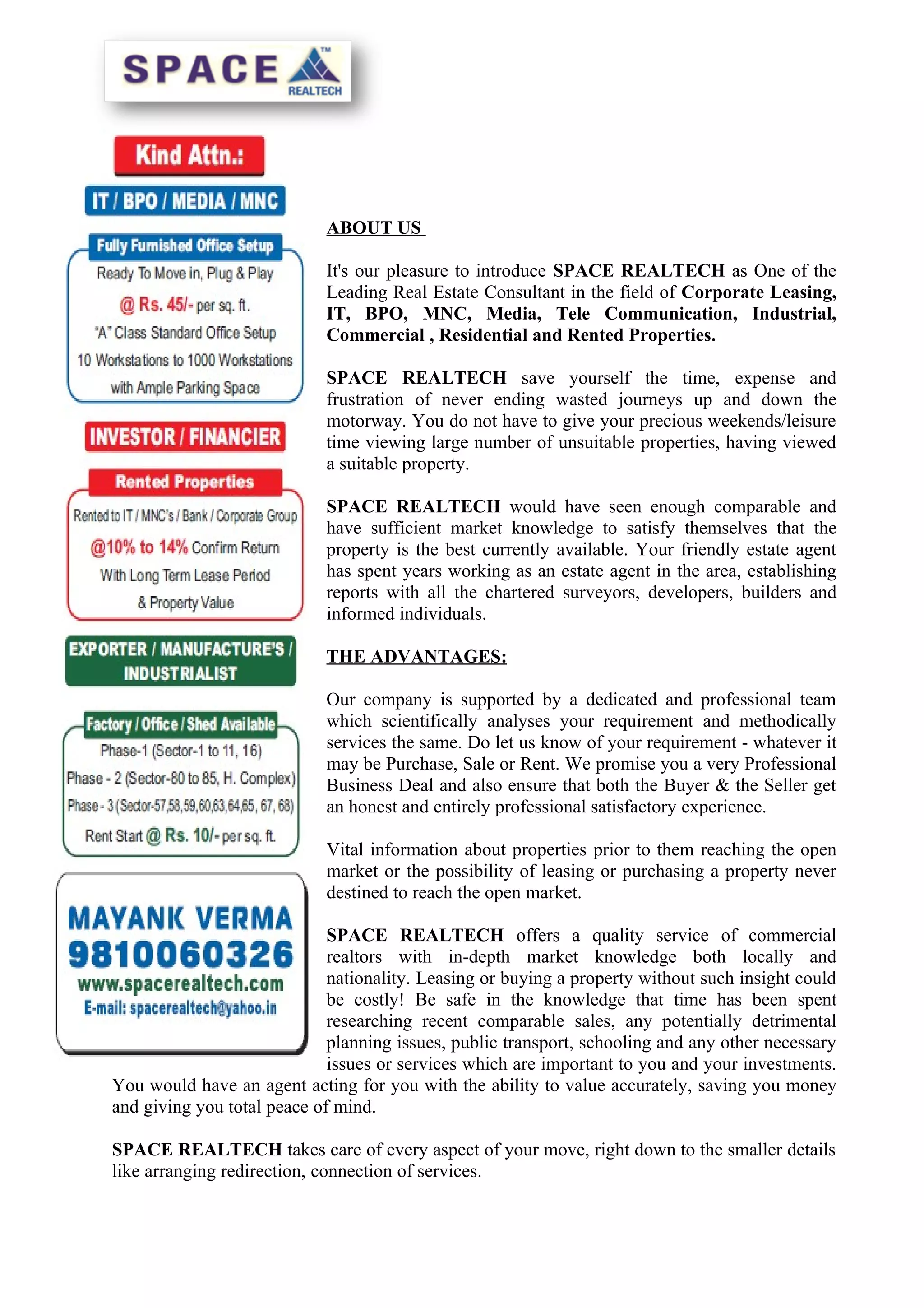 SPACE REALTECH is a leading real estate consultant that provides services for corporate leasing, IT/BPO, MNCs, media, telecommunications, industrial, commercial, and residential properties. It aims to save clients time and frustration by thoroughly researching properties and market comparables. The company has a dedicated professional team that carefully analyzes client requirements and ensures honest, satisfactory experiences for both buyers and sellers. SPACE REALTECH offers expertise in commercial, residential, software/BPO, and rented properties, providing options nationwide.