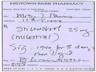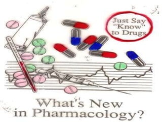 This document defines key terms and concepts in pharmacology. It discusses how pharmacology is the study of drug interactions with living systems. The four main processes that determine a drug's effects are absorption, distribution, metabolism, and excretion. Factors like genetics, age, and health conditions can influence how individuals respond to drugs. Adverse reactions, drug interactions, and tolerance are important considerations when using medications. Standards and regulations aim to ensure drugs are safe, effective, and produced consistently.