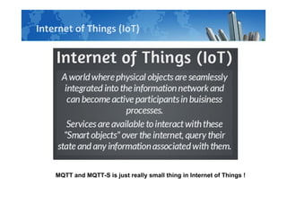 MQTT is a lightweight publish/subscribe messaging protocol that is ideal for constrained environments like sensors and mobile devices. It was invented in 1999 by IBM employees Dr. Andy Stanford-Clark and Arlen Nipper. MQTT uses a broker-based messaging model with a publish/subscribe pattern, and supports three qualities of service. It has been widely adopted in applications involving sensors, mobile devices, and the Internet of Things.