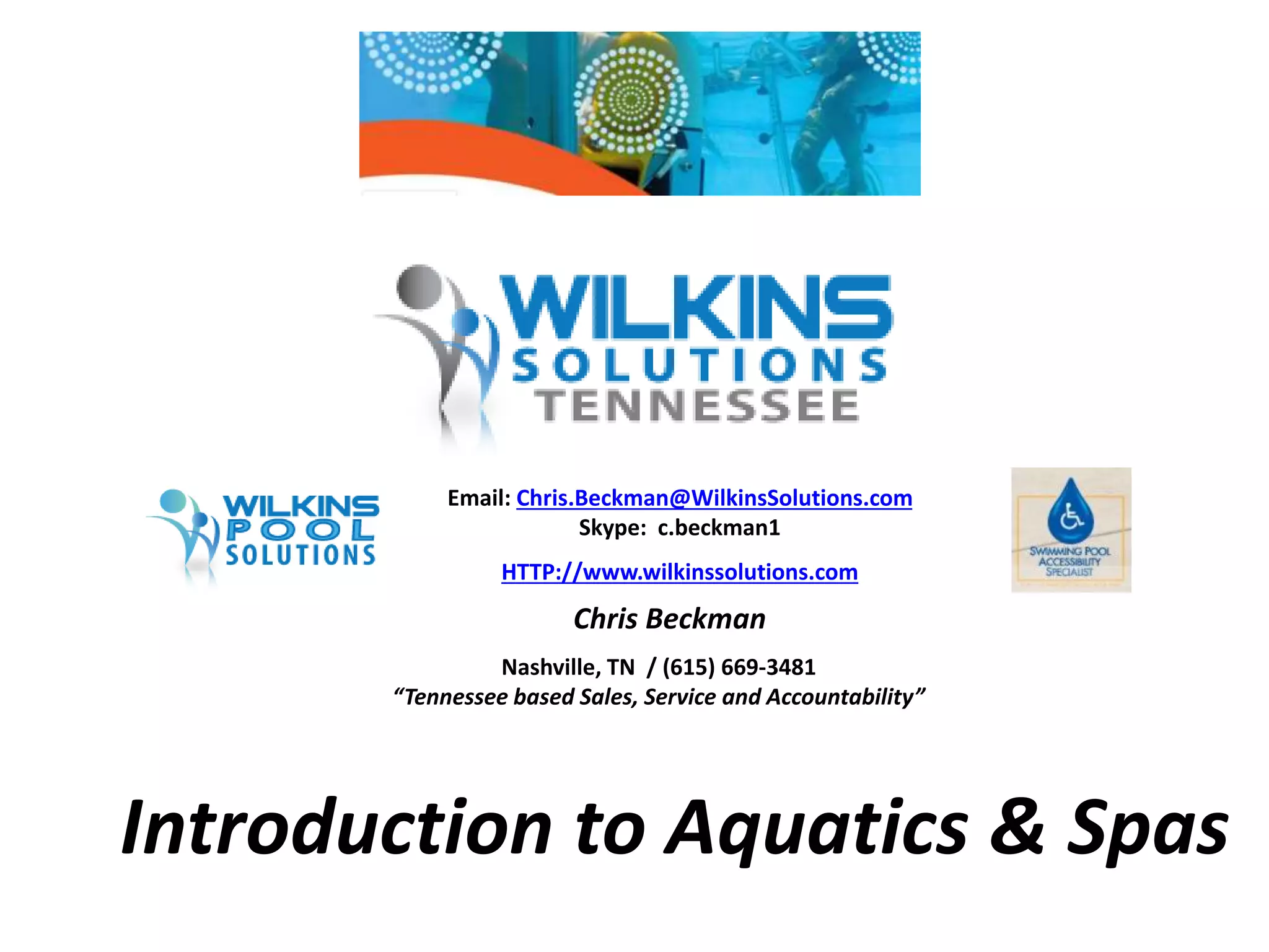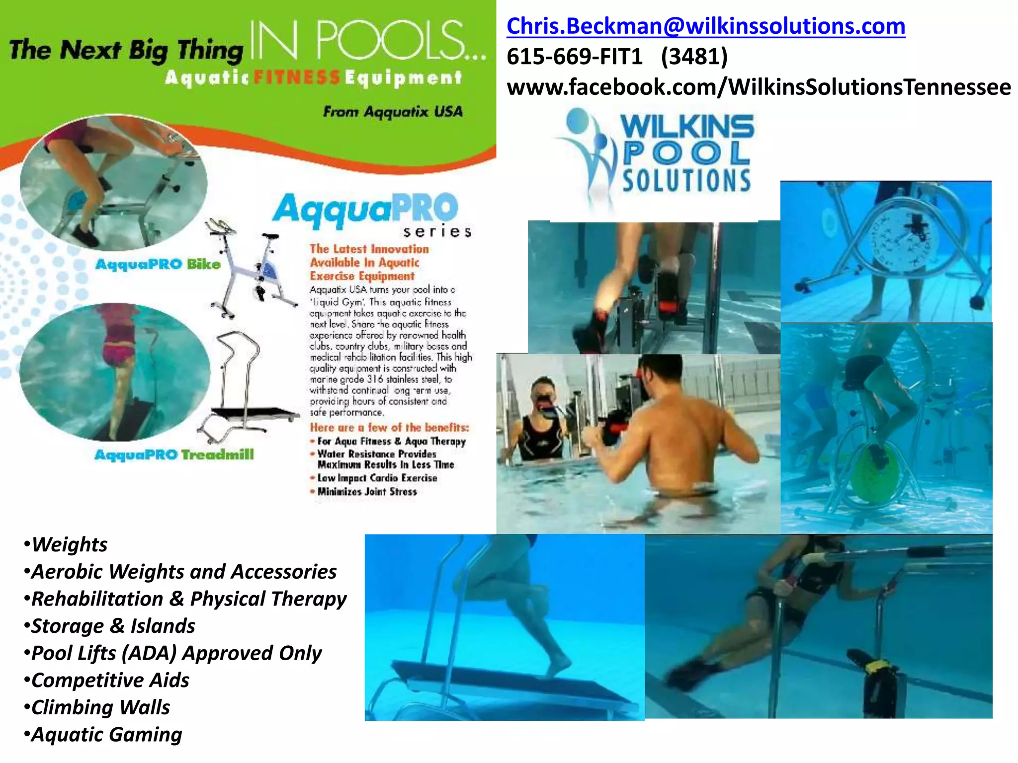 This document provides information on products and services from Wilkins Solutions, including aquatic fitness equipment, pool equipment, spa equipment, tanning beds, and massage equipment. It includes contact information for Chris Beckman and the company website, as well as photos and descriptions of various aquatic fitness machines, pool safety products, spa models, tanning bed options, and the SolaJet massage chair. Product brands mentioned include Aqua Creek, Atera Spa, Bay Collection, Finnleo, Helo, McCoy, ProSun, and SolaJet.