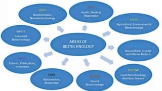 This document provides an introduction and overview of biotechnology. It defines biotechnology as the controlled use of biological agents such as microorganisms and cellular components for beneficial use. The history of biotechnology is discussed, including early discoveries in alcohol production and antibiotics. Key developments include recombinant DNA technology and cloning. Old biotechnology includes processes like fermentation, while new biotechnology uses techniques like recombinant DNA and PCR. Achievements include genome mapping, gene cloning, gene banks, and applications in agriculture, health care, industry, and the environment.