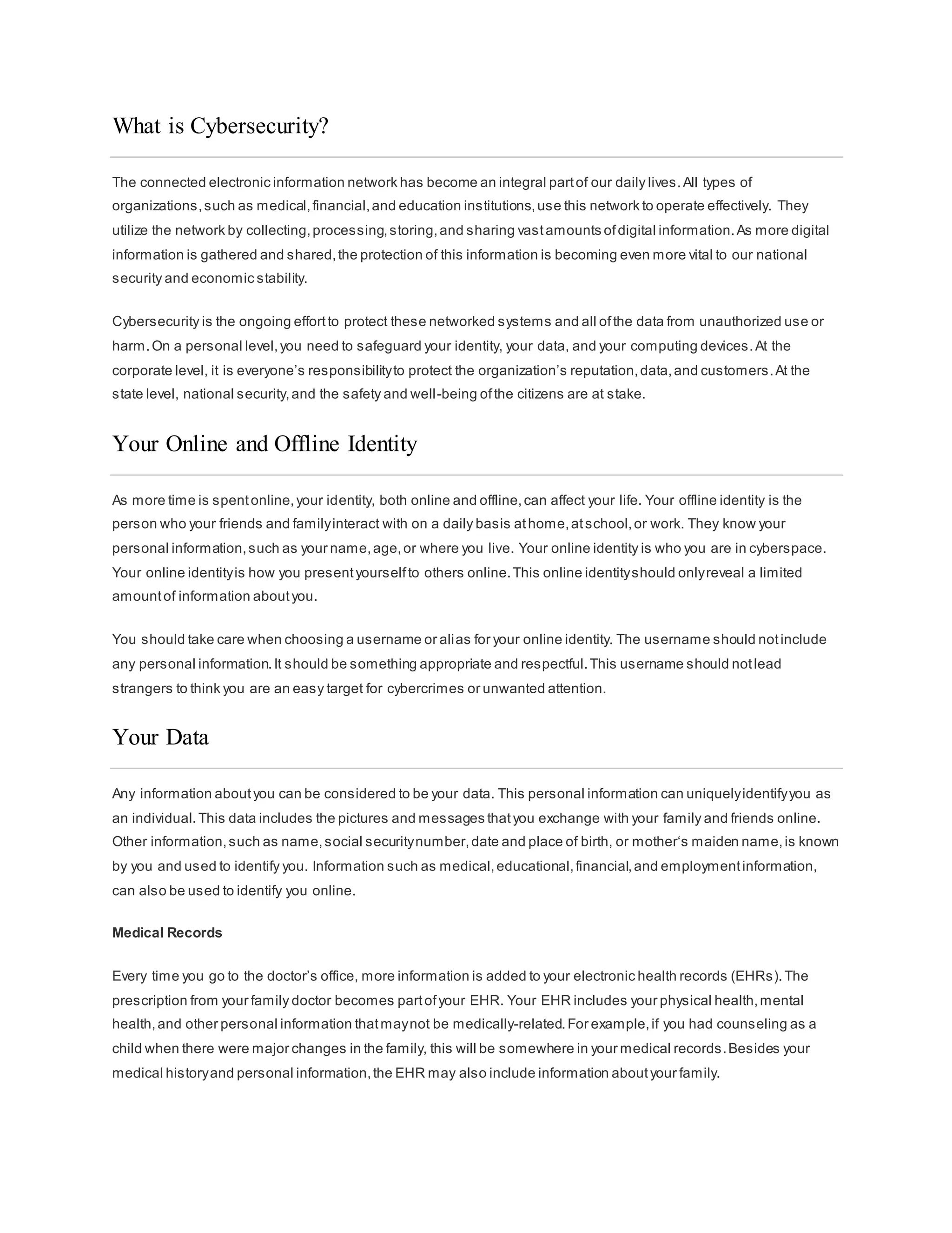 The document discusses cybersecurity and the importance of protecting personal, organizational, and government data from unauthorized access or harm. It defines cybersecurity as the ongoing effort to safeguard networked systems and data. It also provides examples of personal data like medical records, education records, employment and financial records that need to be secured. Additionally, it discusses the consequences of data breaches for individuals and organizations.