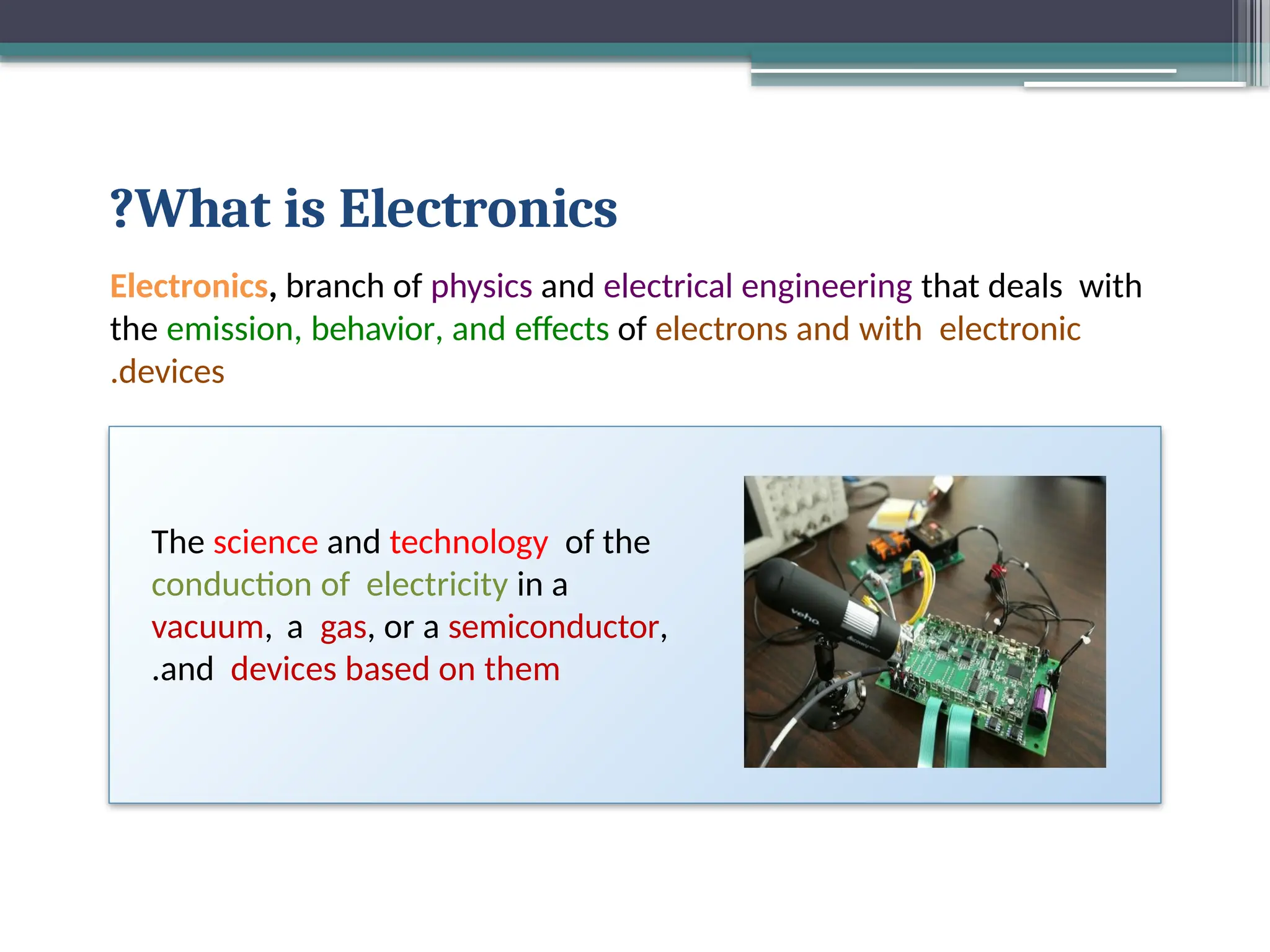 The document introduces electronics as a branch of physics and electrical engineering focused on electron behavior and electronic devices, tracing its historical development through key innovations like the vacuum tube, transistor, and integrated circuit. It highlights milestones such as the invention of the diode, advancements in radio and television, and the transition to transistors and integrated circuits, revolutionizing technology. The integration of numerous circuits on a single chip has led to essential modern applications in various fields.