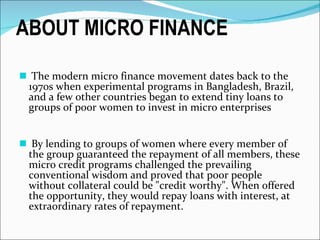 Microfinance involves providing small loans, savings opportunities, and other basic financial services to low-income individuals. It began in the 1970s with programs lending small amounts to groups of poor women. In India, microfinance has existed informally for ages and various government initiatives over time helped establish a legal framework and institutions to support it, such as cooperative banks and NABARD. Today, around 60% of microfinance institutions in India are registered as societies and most use the self-help group model to deliver services to over 100 million poor households.