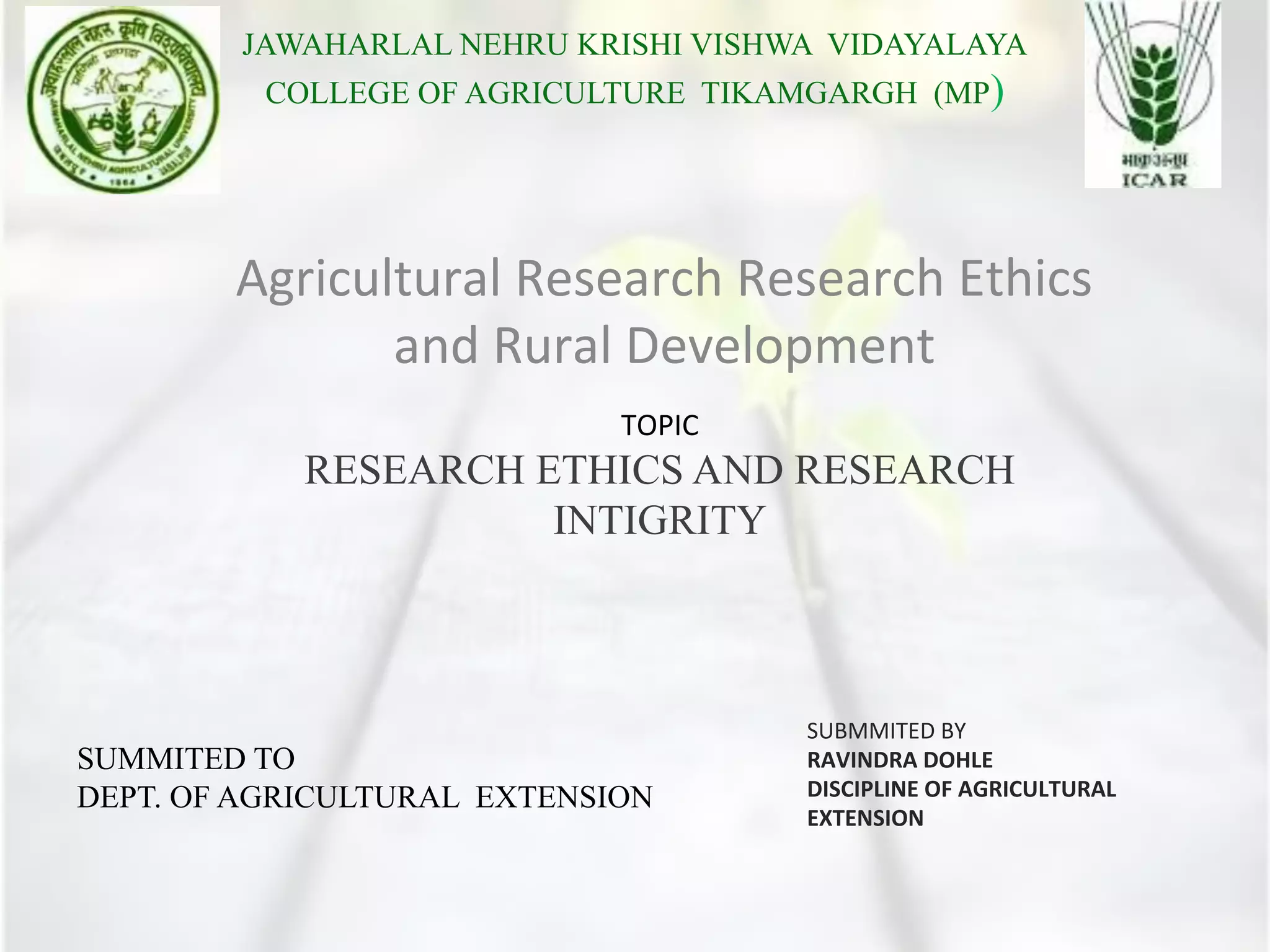 The document discusses research ethics and integrity within the context of agricultural research, emphasizing the importance of ethical principles such as honesty, fairness, and respect for participants. It highlights the need for community involvement in research, the significance of informed consent, and the ethical ramifications associated with various research practices. Key ethical criteria including beneficence, justice, and protecting confidentiality are underscored to ensure responsible research conduct.