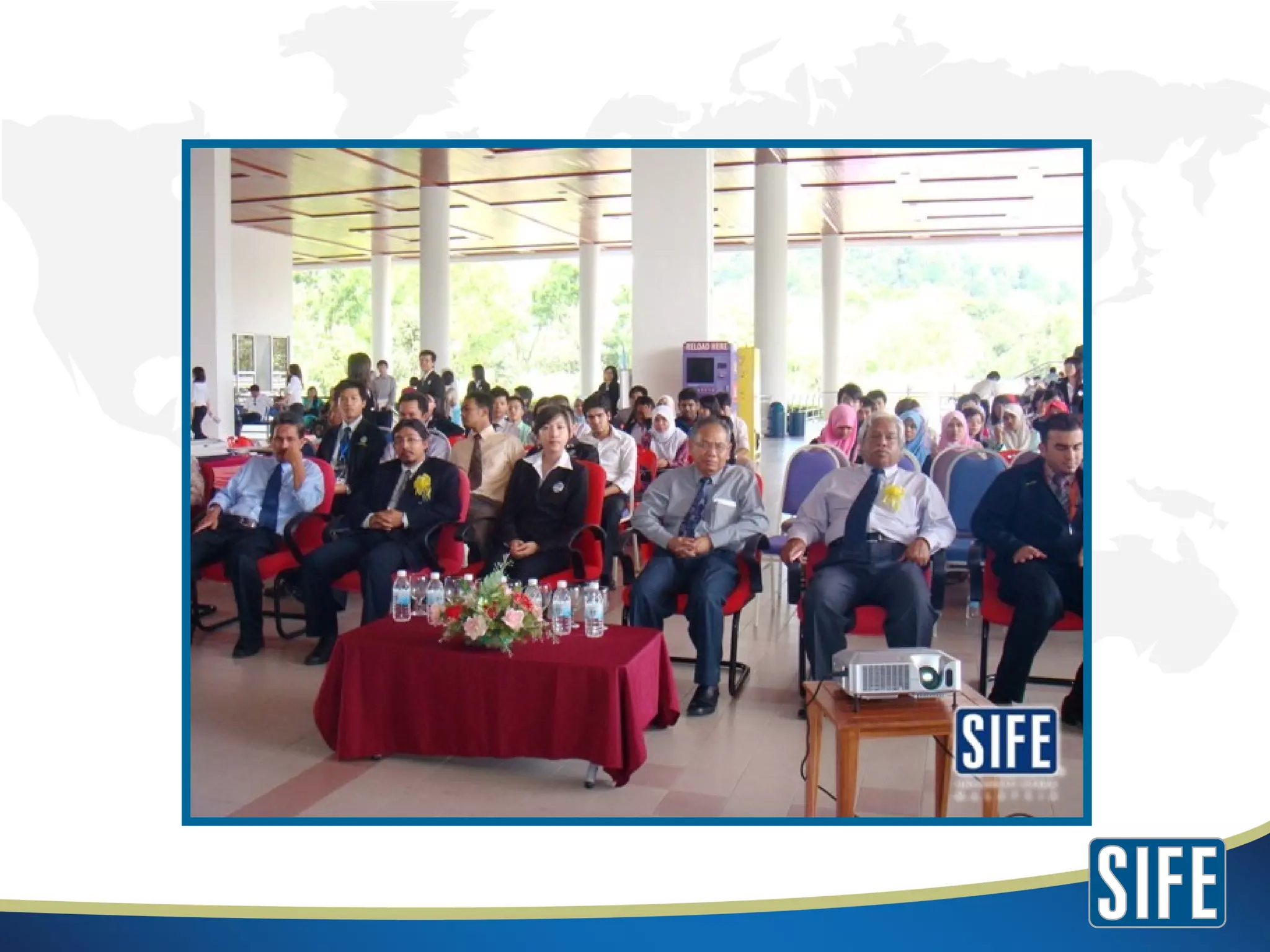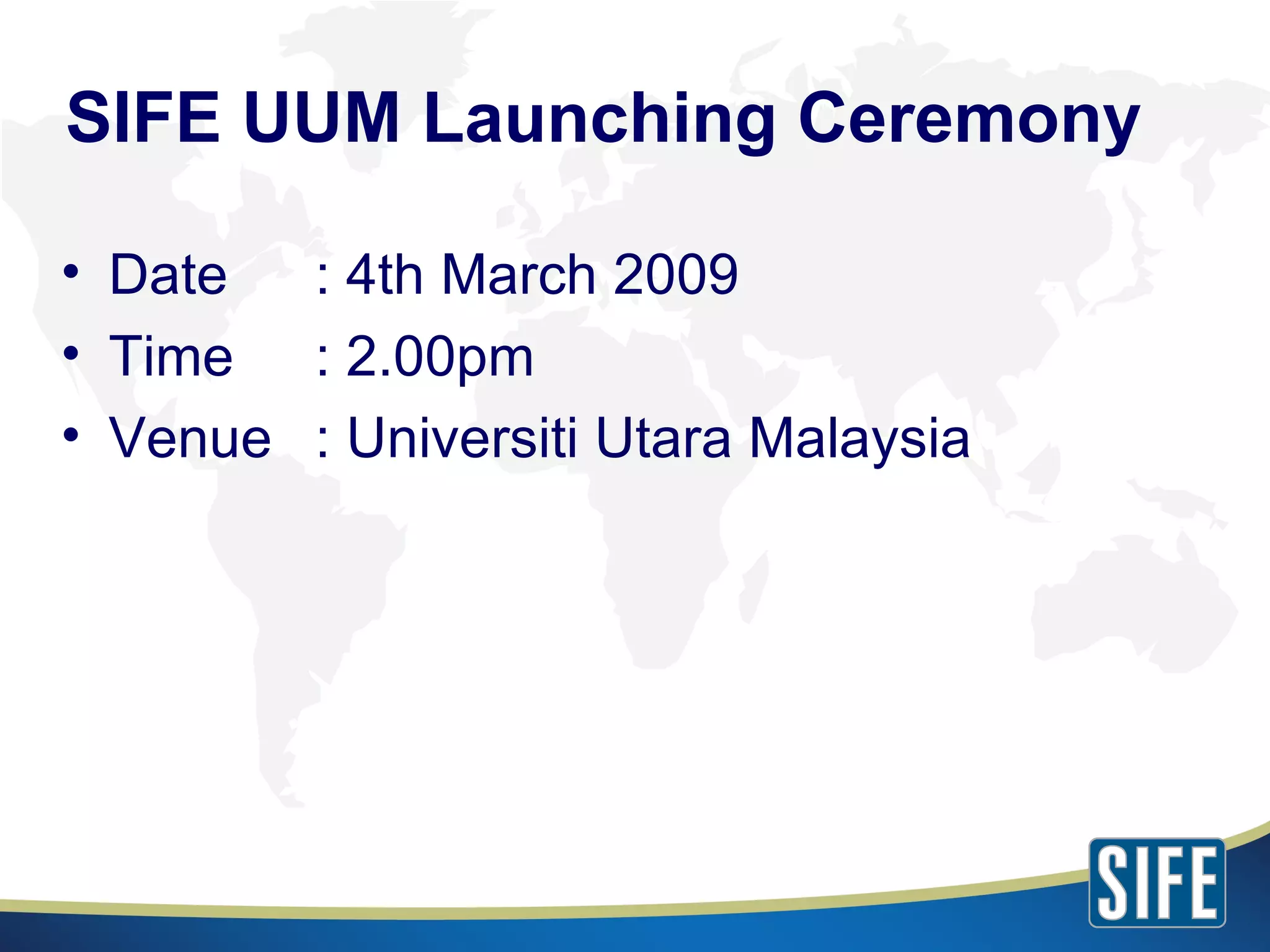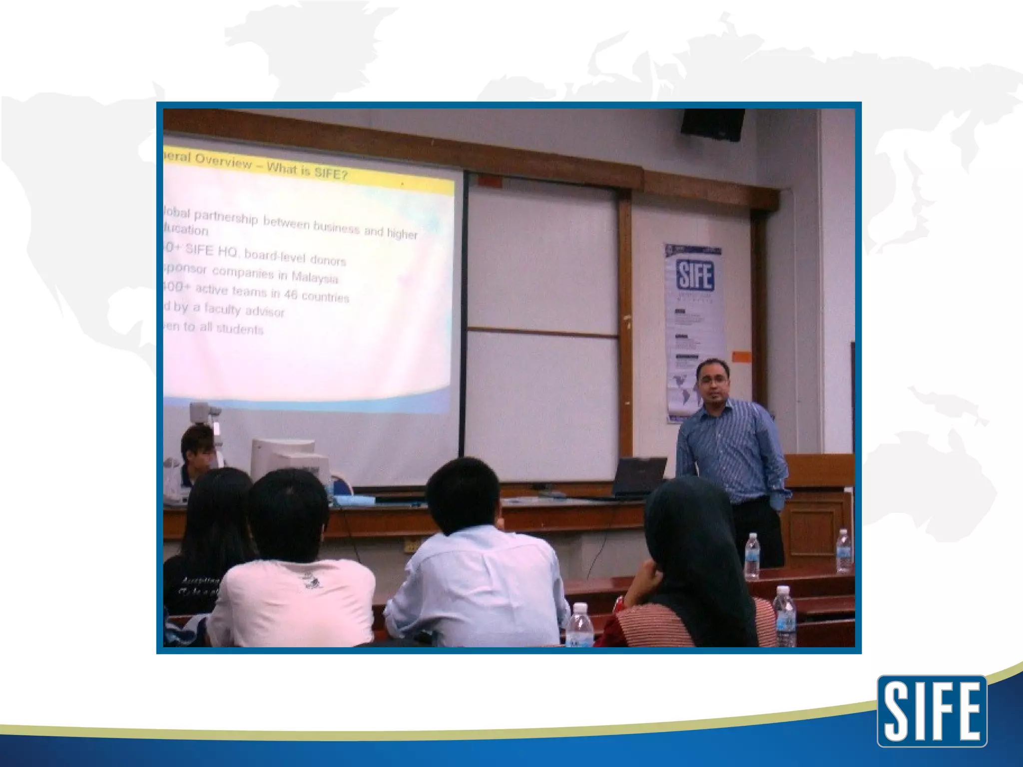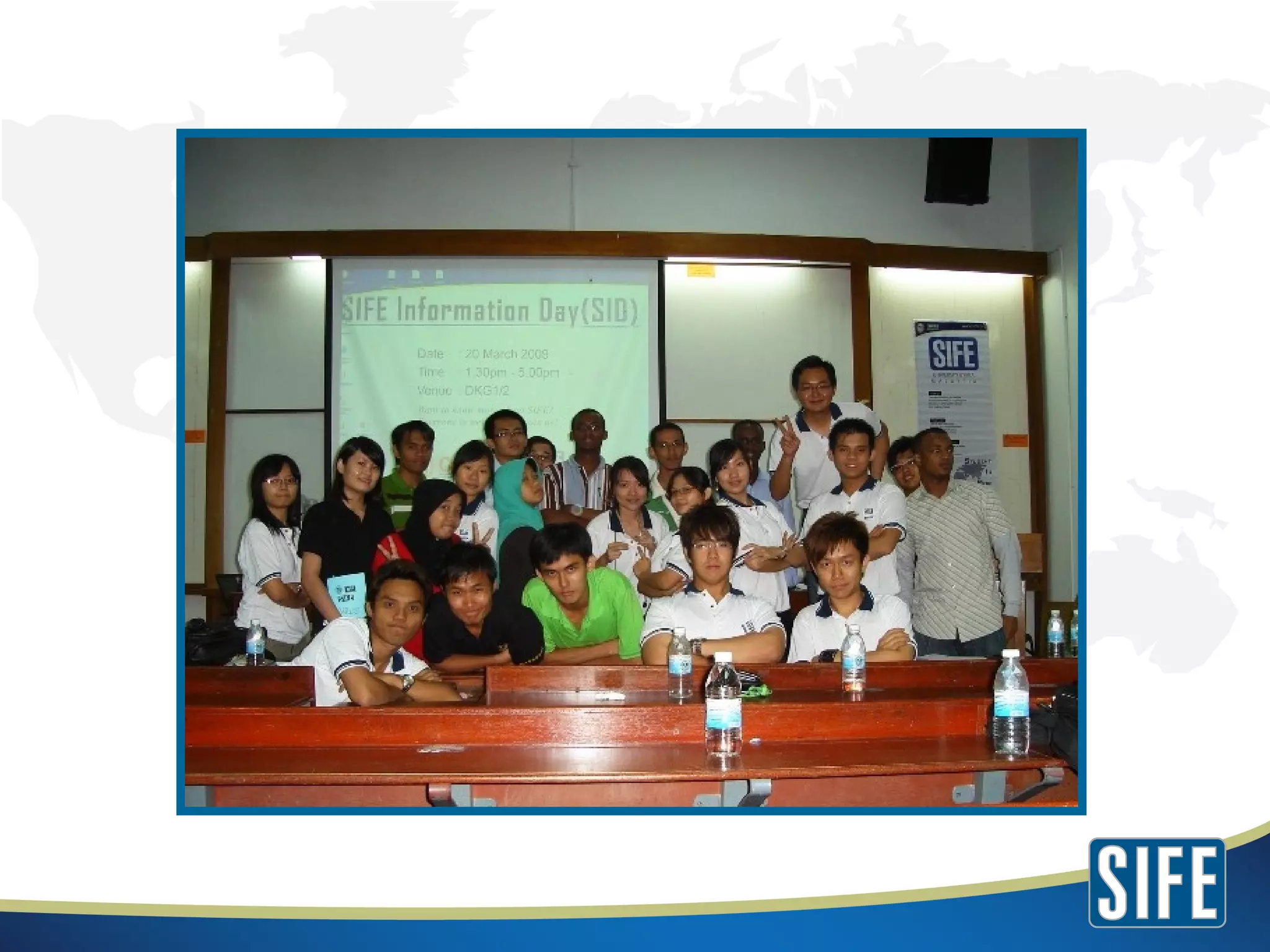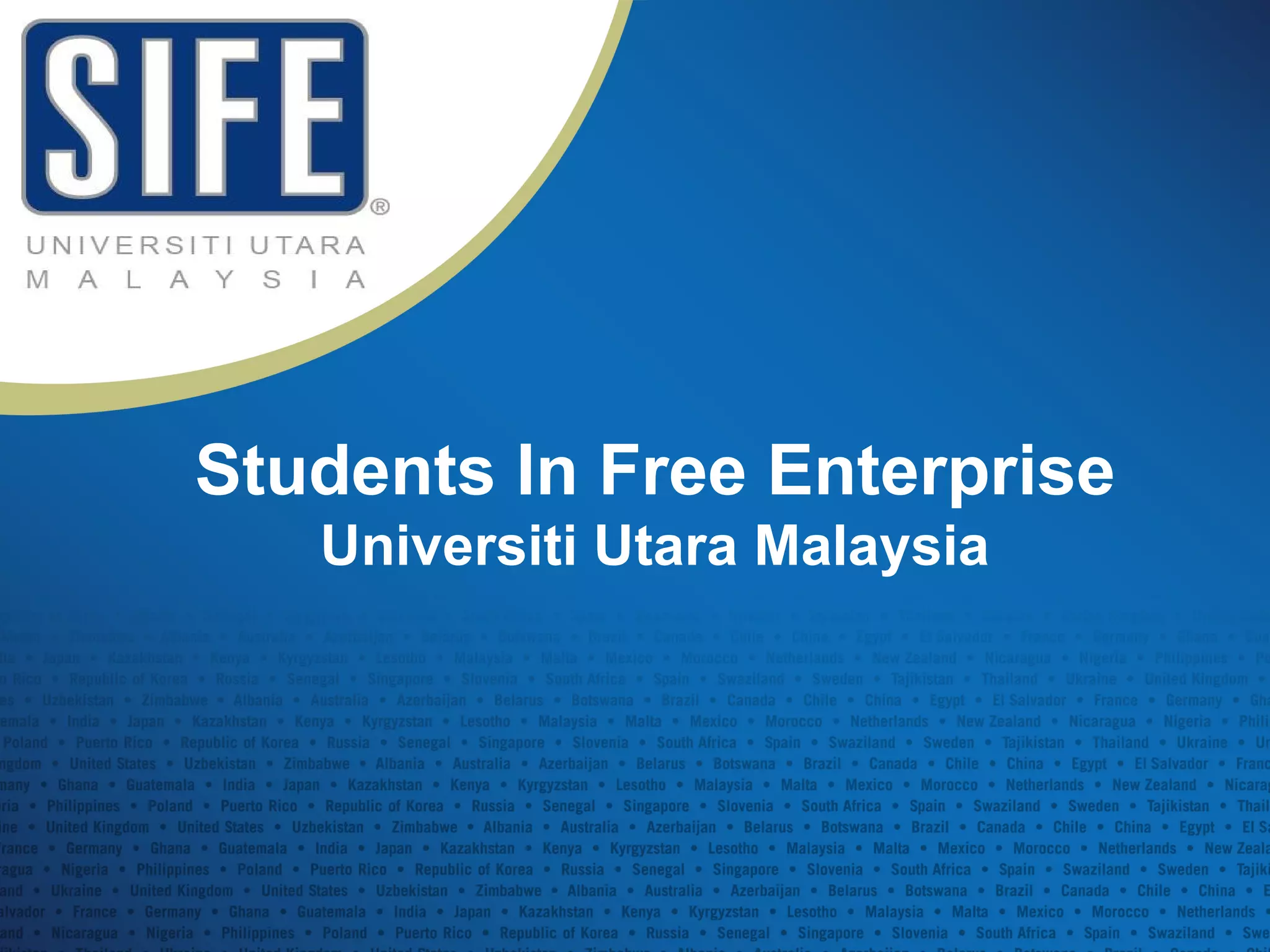 The document summarizes information about Students In Free Enterprise Universiti Utara Malaysia (SIFE UUM). SIFE UUM aims to discover, develop and inspire future entrepreneurs through community projects that teach principles of economics and entrepreneurship. Upcoming projects include youth seminars, entrepreneurship conventions, and design challenges. SIFE teams undertake these projects to address social issues through skills training in the community.