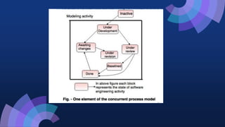 The document provides information on software engineering and the software development process. It discusses course objectives and outcomes for a software engineering course. It then covers various software process models including the waterfall model, incremental process model, RAD model, prototyping model, and spiral model. The document also discusses the generic process framework which includes activities like communication, planning, modeling, construction, and deployment. It provides details on process flow, the software engineering fundamentals, and the nature of software.