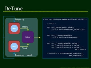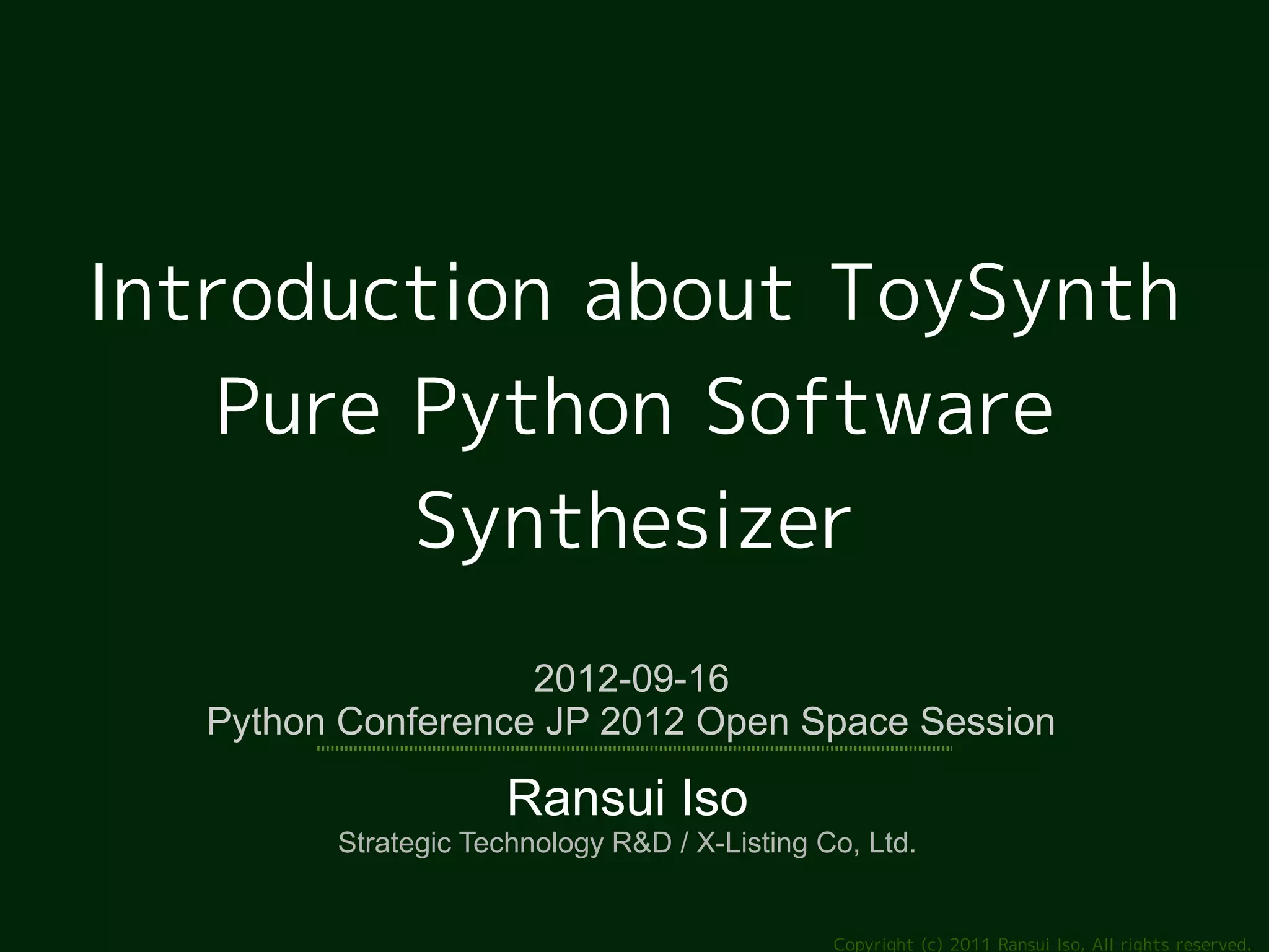 The document provides an introduction to ToySynth, a pure Python software synthesizer discussed at the 2012 Python Conference. It explains the components of ToySynth, including its simple architecture, limited performance, and features for generating sound, such as a music macro language and sequencing capabilities. Users can download the software via a provided link and explore creating their own sound modules.