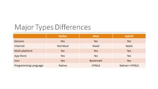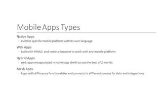 The document introduces mobile development and provides an overview of programming languages, environments, operating systems, and cross-platform tools. It discusses languages like Swift, Kotlin, and Java and platforms like iOS and Android. It also covers cross-platform options like Flutter that allow building mobile apps using one codebase. The presentation concludes with specifications for an ideal mobile development machine and opening the floor for questions.