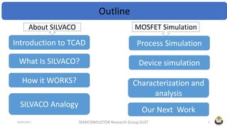 The document discusses simulation of MOSFETs using SILVACO TCAD software. It provides an overview of SILVACO and the process and device simulation capabilities. The document then walks through the steps of simulating a MOSFET fabrication process using ATHENA and defining the materials and doping steps. It describes analyzing the fabricated device using ATLAS to extract characteristics and define contacts before discussing plans to simulate additional devices by varying parameters.