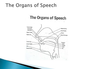 The document provides an overview of phonetics, focusing on its three branches: articulatory, acoustic, and auditory phonetics. It explains the production and perception of speech sounds, detailing the role of various anatomical structures involved in speech and how air is manipulated to create sound. A discussion on the anatomy related to speech production is also included, highlighting components such as the larynx, vocal tract, and articulators.
