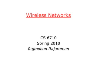 The document outlines a course on wireless networks covering fundamental and advanced topics such as transmission techniques, coding, cellular networks, and ad hoc networks. It discusses the history and evolution of wireless communication technologies, applications, market growth, limitations, and technical challenges. The document also categorizes wireless systems, explains transmission media, and details various antenna configurations for different frequency ranges.