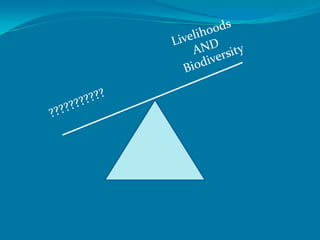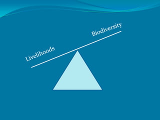 The document discusses the LiveDiverse project which aims to improve livelihoods while protecting biodiversity in developing countries. It examines six case study areas across Europe, Africa, Asia, and Central and South America. The overall strategy involves creating a knowledge base on vulnerabilities, public perceptions, mapping vulnerable areas, identifying biodiversity and livelihood "hotspots", developing scenarios, and formulating policy recommendations. The project brings together natural and social science perspectives to engage stakeholders and develop sustainable solutions at the biodiversity-livelihood interface.