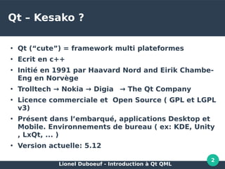 Le document présente une introduction au framework Qt et à son langage de programmation QML, en abordant son historique, son écosystème et ses composantes clés. Il traite des fonctionnalités de QML, telles que le positionnement, les animations et la gestion des données, tout en fournissant des exemples pratiques. Enfin, il évoque des ressources pour approfondir les connaissances et les retours d'expérience sur son utilisation.