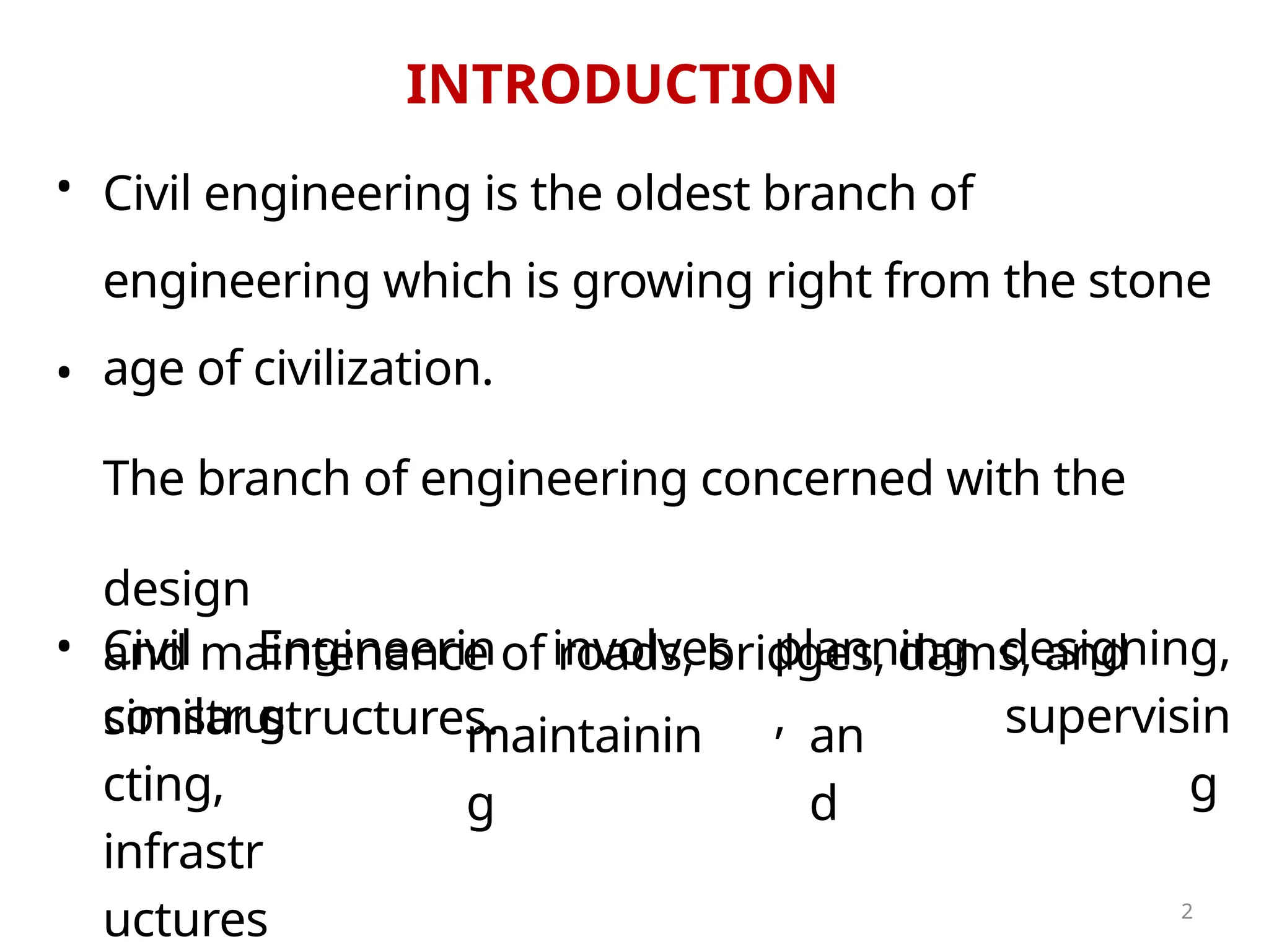 Civil engineering involves the planning, designing, and supervision of infrastructure, including roads, bridges, and dams. It encompasses various branches such as structural, transportation, and environmental engineering, focusing on the safety and efficiency of these constructions. The document outlines the scope and responsibilities of each specialization within civil engineering, highlighting the importance of good design and resource management.