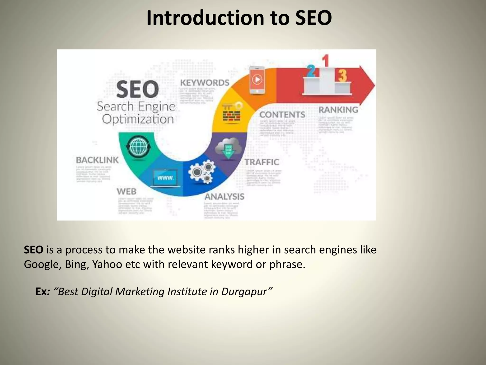 SEO is the process of optimizing a website to increase its visibility in organic search engine results. This involves keyword research to target relevant search terms, on-page optimization of content and code to include those keywords, and off-page activities to build backlinks. Properly optimized websites are indexed by search engines and can appear in different types of search results like organic listings, featured snippets, local maps, and knowledge panels. SEO is important because it is the primary source of free traffic to most websites, helps build trust and credibility through authoritative content, and provides a quantifiable way to understand website performance and make improvements over time.