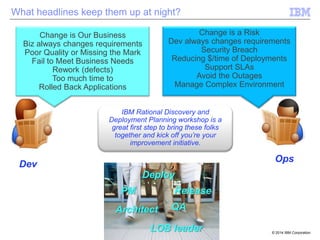 The document describes an IBM Rational Discovery and Deployment Planning workshop. The workshop aims to (1) assess a client's current development and deployment capabilities, (2) define a vision and prioritize improvements to those capabilities based on IBM best practices, and (3) develop a roadmap to implement the improvements. Participants would include key leaders from development, operations, and other stakeholder teams. The workshop would analyze the client's goals, practices, technologies, and challenges. It would produce recommendations for capability improvements, an initial architecture design, and an adoption roadmap to implement changes in a phased approach based on proven practices.