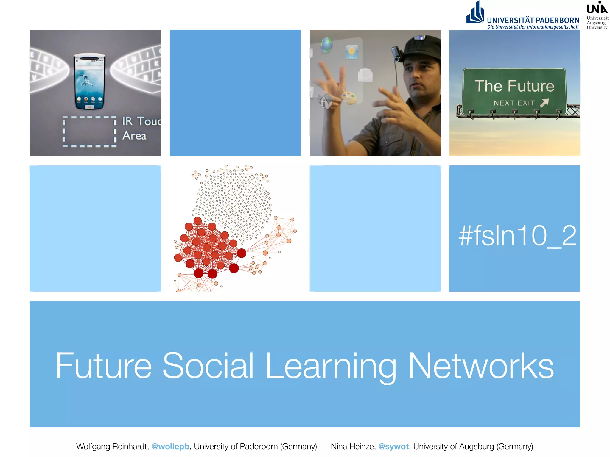 The document outlines the goals and organization of a seminar on future social learning networks between the University of Paderborn and the University of Augsburg. The goals include learning through practical application, interdisciplinary cooperation, examining topics through literature work and empirical studies. The seminar will be organized into topics with students from each university collaborating using web tools. Participants will choose topics and collaborate virtually. Progress will be documented in a wiki and final papers submitted.
