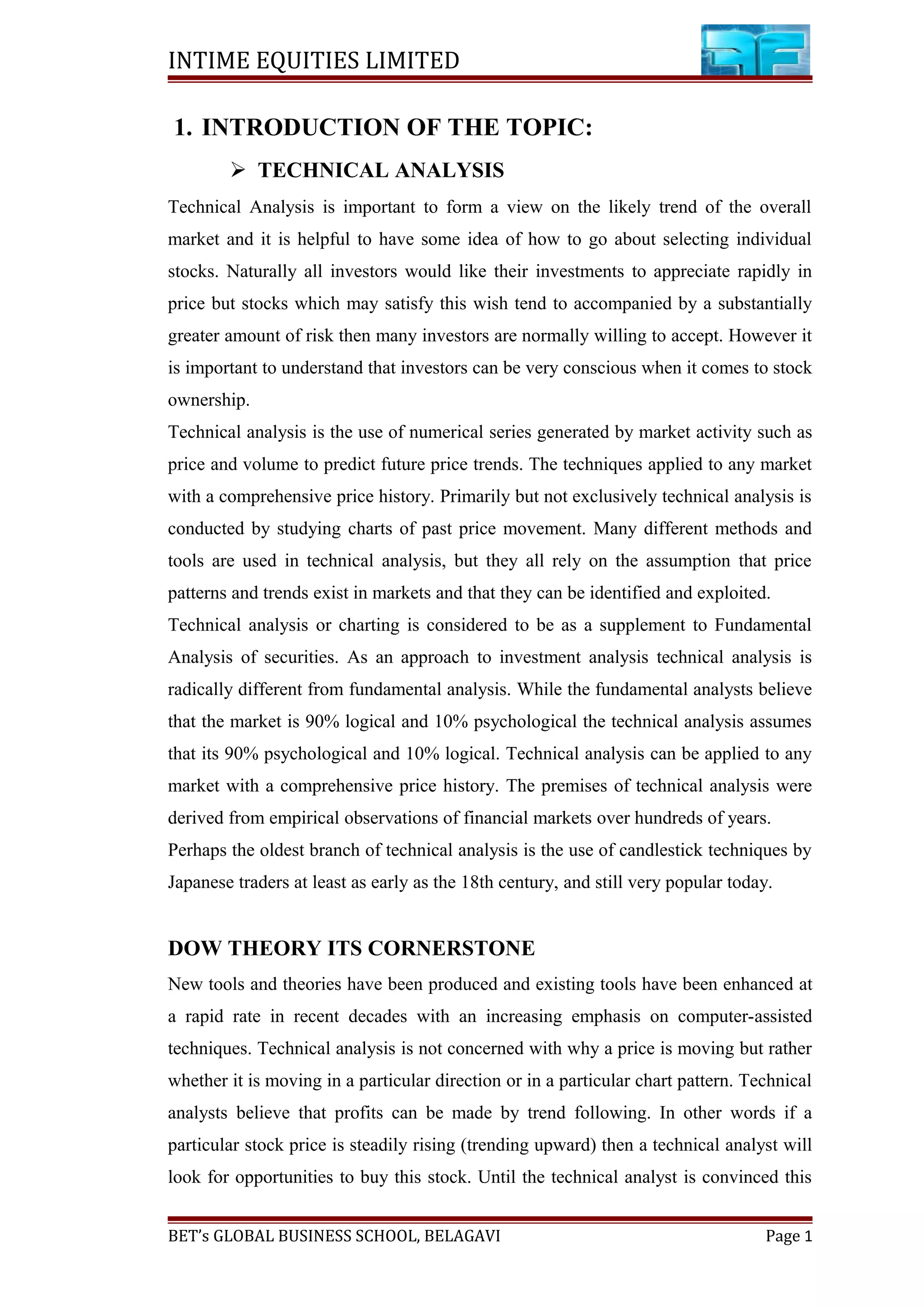 The document discusses technical analysis as a method used by investors to forecast future stock prices based on historical market data such as price movement and volume. It contrasts technical analysis with fundamental analysis, emphasizing its focus on trends and patterns rather than intrinsic value. The study aims to analyze various selected sectors in the Indian stock market, using technical indicators to assist investors in making informed trading decisions.